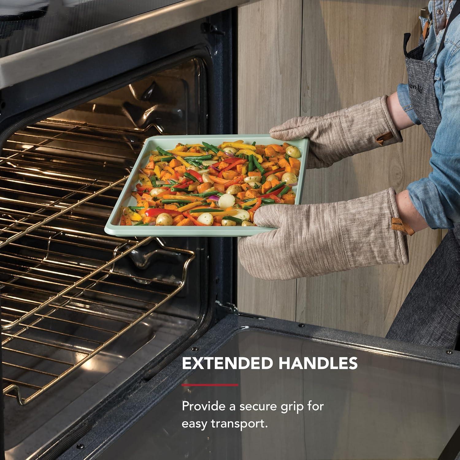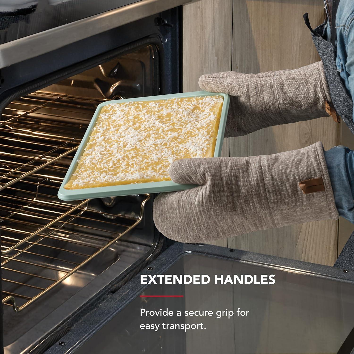 EXTENDED HANDLES: provide a secure grip for easy transport, making transferring pan in and out of the oven safer and simpler, even when wearing pot holders