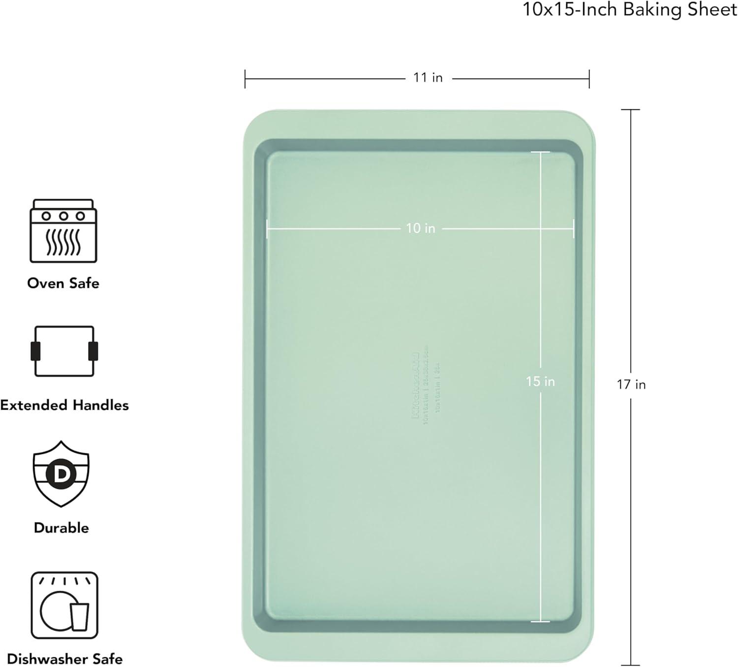 The KitchenAid 10×15-inch Baking Sheet is perfect for making cookies, jelly rolls, sheet cakes, or one-pan meals. Highly durable, this nonstick, oven-safe, heavy-duty aluminized steel pan stands up to high heat for all your baking needs and features a uniquely designed rim to prevent warping. It evenly distributes heat for consistent baking results and has extended handles that provide a secure grip for easy transport. Dishwasher safe.