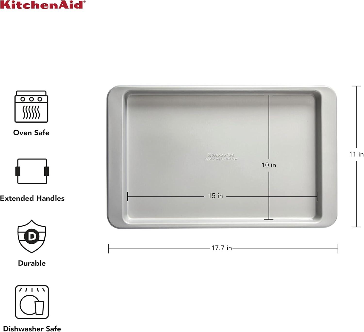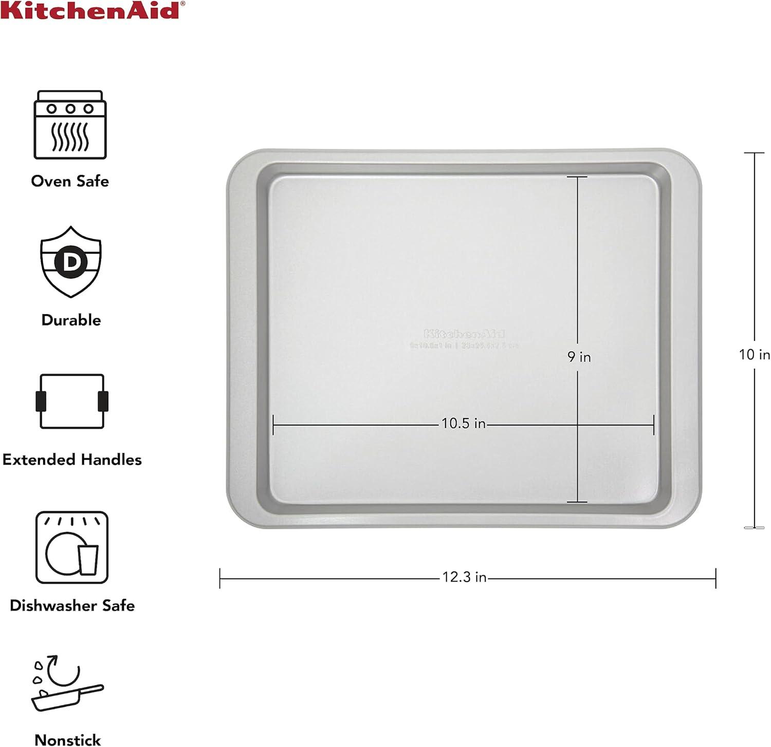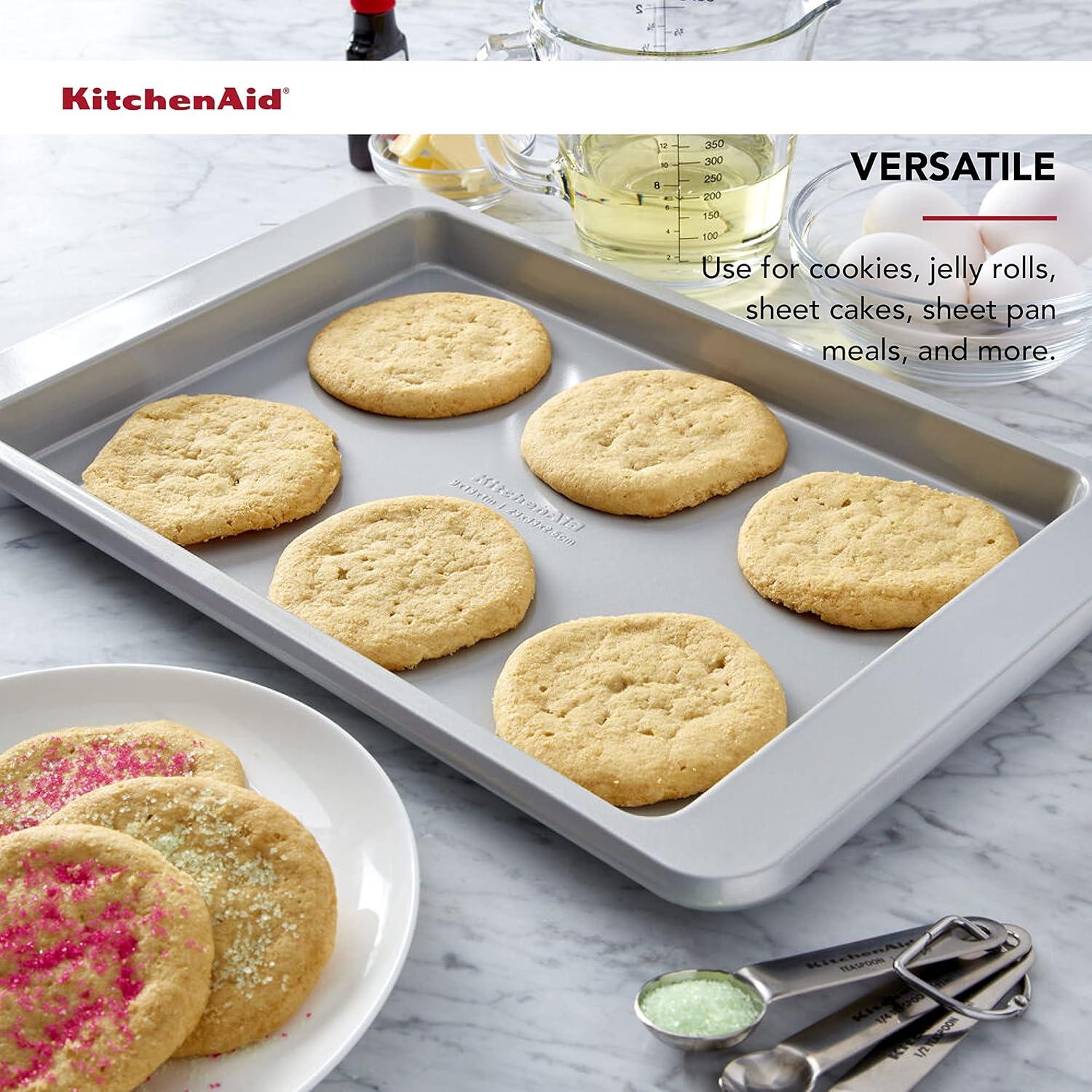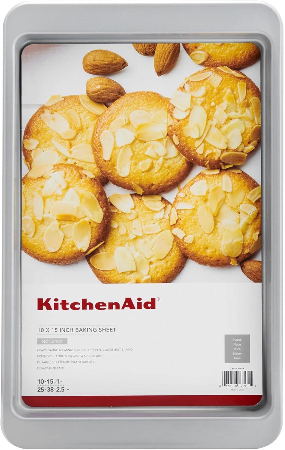 The KitchenAid 10×15-inch Baking Sheet is perfect for making cookies, jelly rolls, sheet cakes, or one-pan meals. Highly durable, this nonstick, oven-safe, heavy-duty aluminized steel pan stands up to high heat for all your baking needs and features a uniquely designed rim to prevent warping. It evenly distributes heat for consistent baking results and has extended handles that provide a secure grip for easy transport. Dishwasher safe.