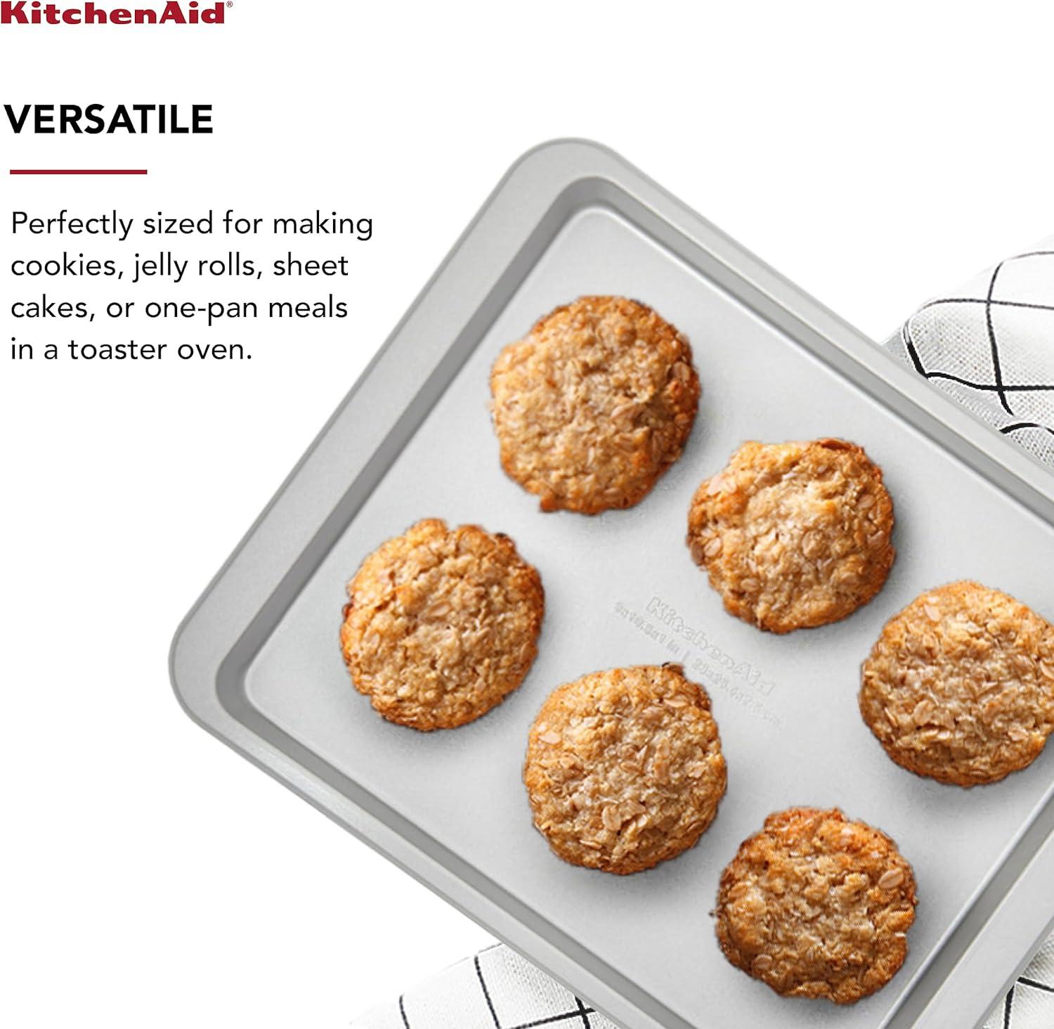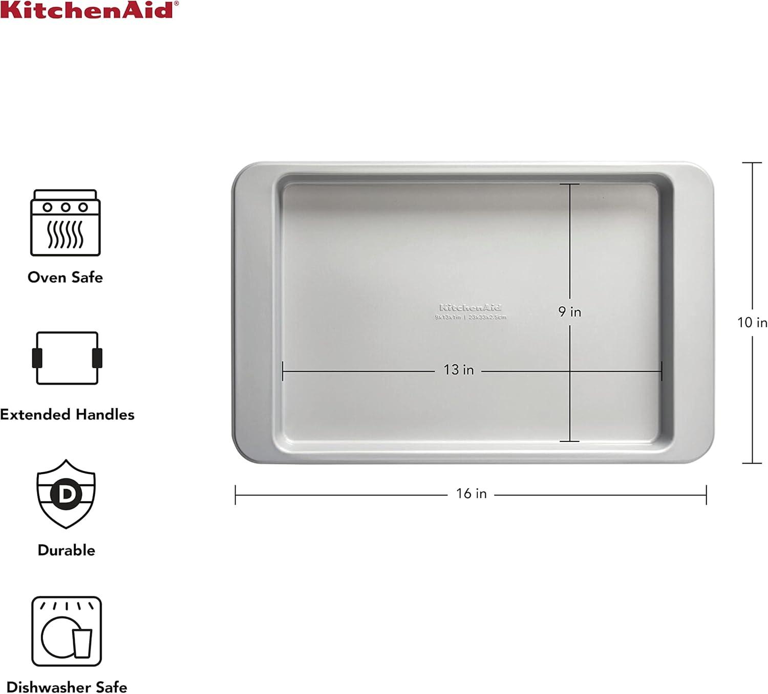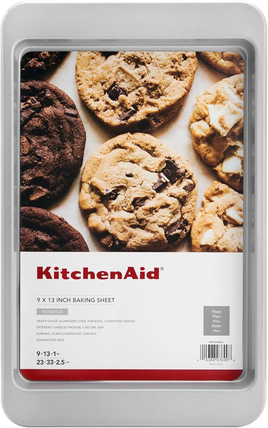 The KitchenAid 10×15-inch Baking Sheet is perfect for making cookies, jelly rolls, sheet cakes, or one-pan meals. Highly durable, this nonstick, oven-safe, heavy-duty aluminized steel pan stands up to high heat for all your baking needs and features a uniquely designed rim to prevent warping. It evenly distributes heat for consistent baking results and has extended handles that provide a secure grip for easy transport. Dishwasher safe.