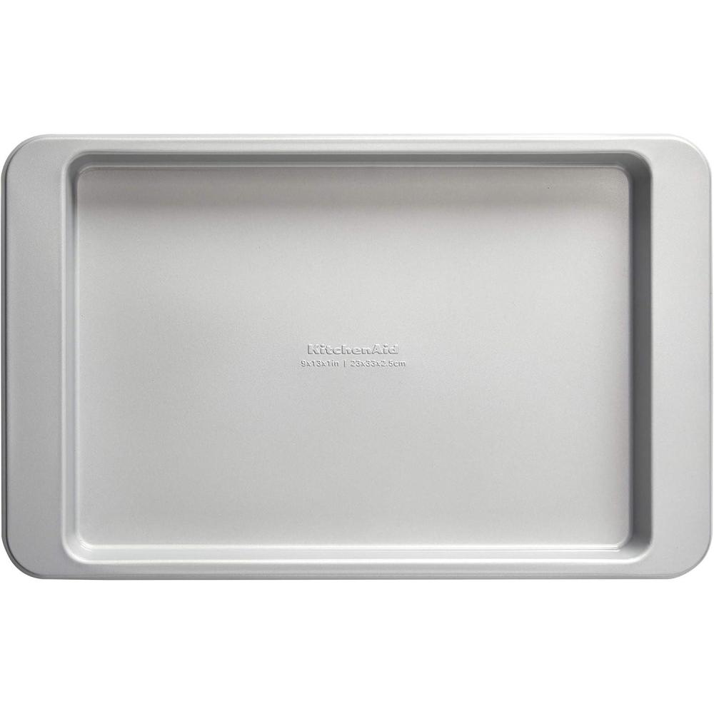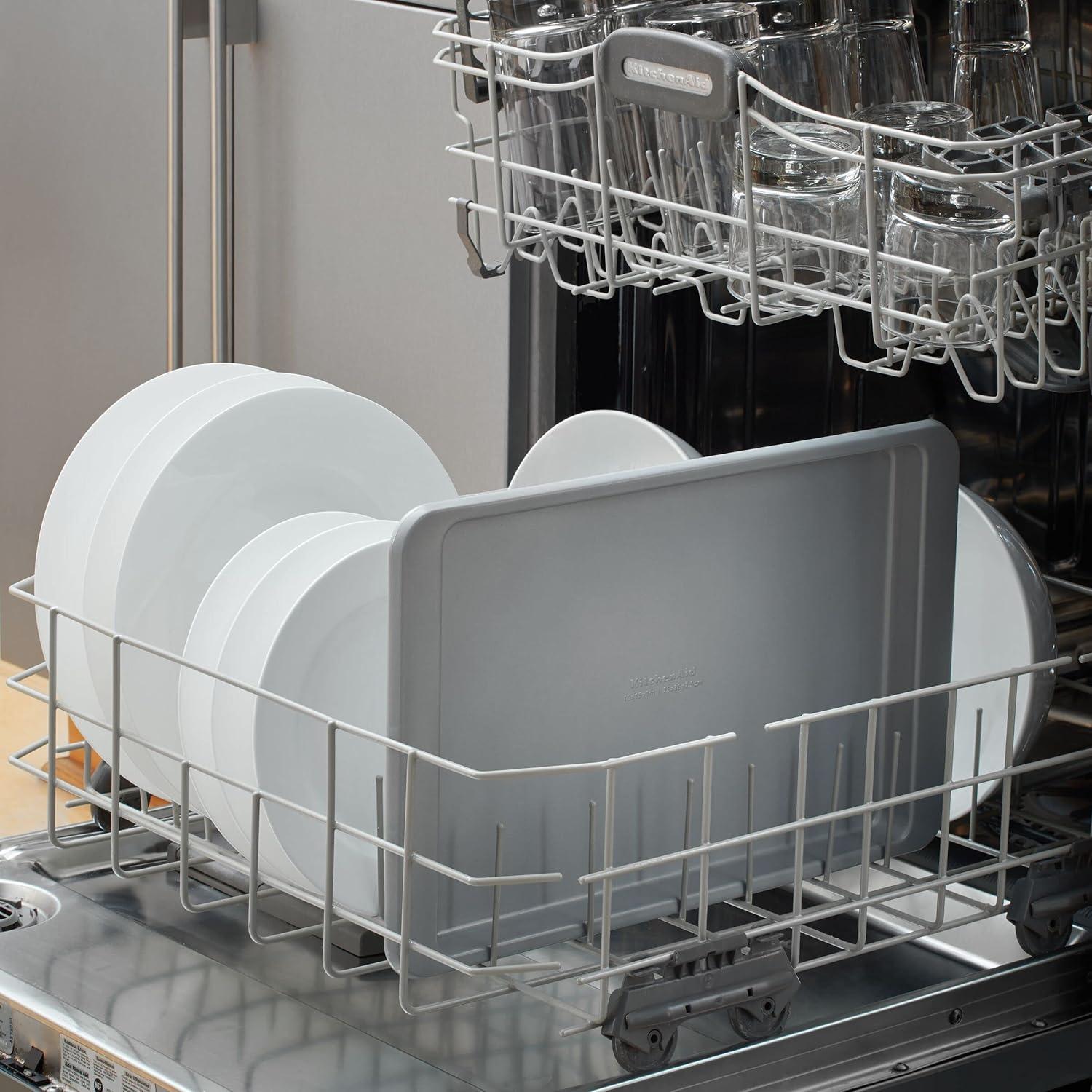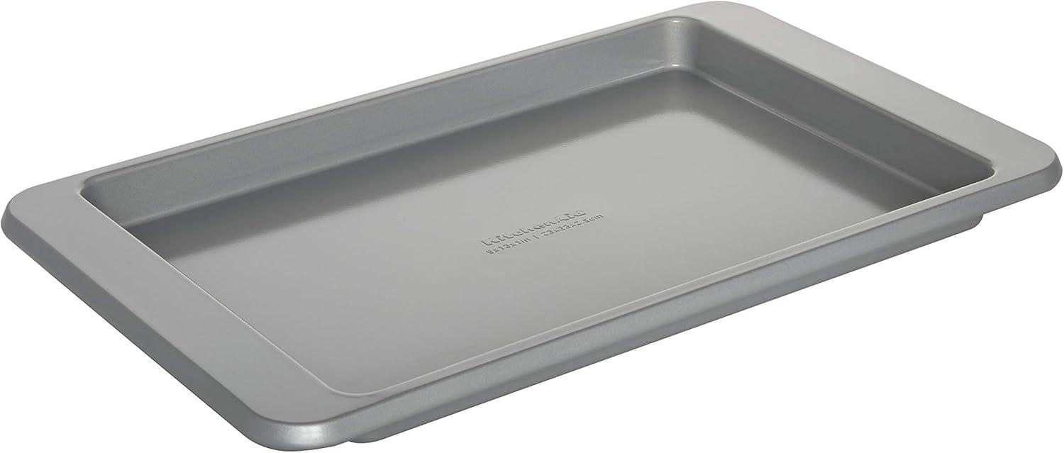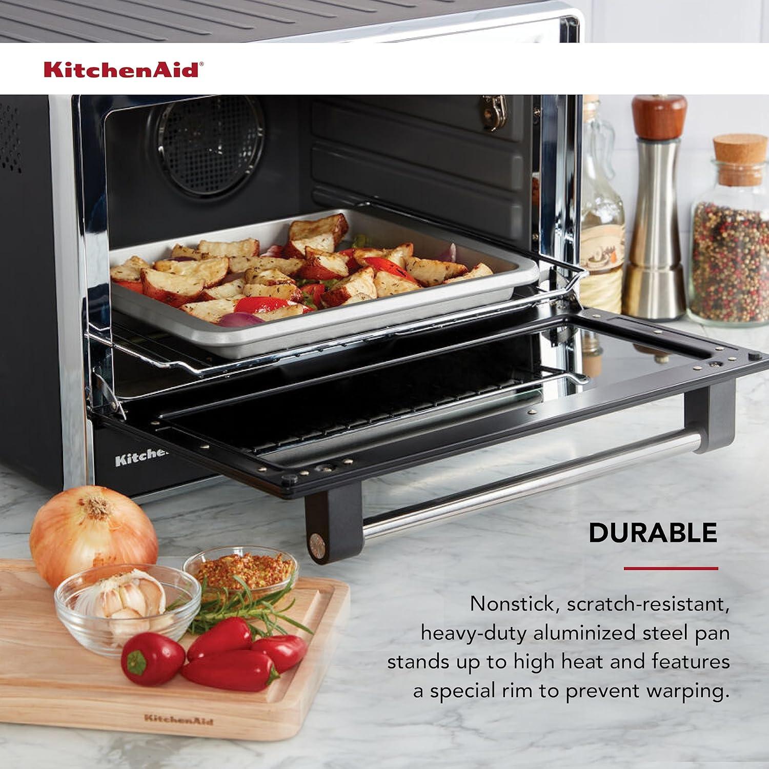 The KitchenAid 10×15-inch Baking Sheet is perfect for making cookies, jelly rolls, sheet cakes, or one-pan meals. Highly durable, this nonstick, oven-safe, heavy-duty aluminized steel pan stands up to high heat for all your baking needs and features a uniquely designed rim to prevent warping. It evenly distributes heat for consistent baking results and has extended handles that provide a secure grip for easy transport. Dishwasher safe.