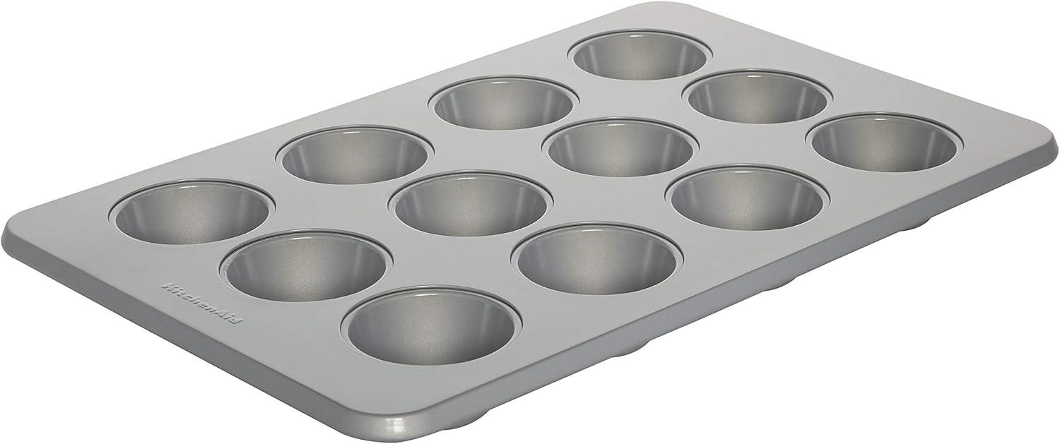 The KitchenAid 12-Cup Muffin Pan is perfect for making 12 evenly sized and shaped muffins, cupcakes, and egg bites. Highly durable, this nonstick, oven-safe, heavy-duty aluminized steel pan stands up to high heat for all your baking needs and features a uniquely designed rim to prevent warping. It evenly distributes heat for consistent baking results and has extended handles that provide a secure grip for easy transport. Dishwasher safe.