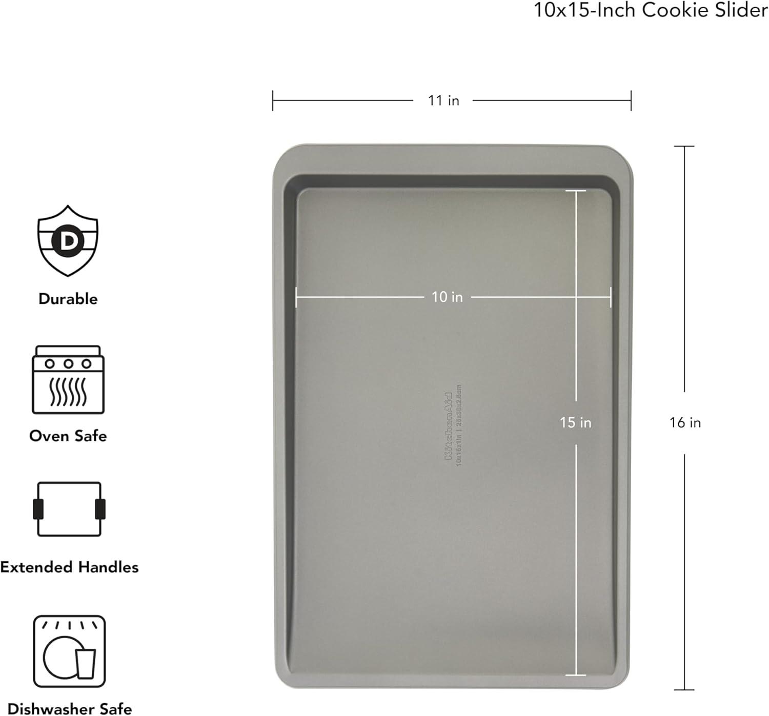 The KitchenAid 13×18-inch Cookie Slider is perfect for making cookies, pastries, pizza, roasted veggies, or one-pan meals. The unique angled design and nonstick coating promote effortless transfer from sheet to cooling rack. Highly durable, this nonstick, oven-safe, heavy-duty aluminized steel pan stands up to high heat for all your baking needs and features a uniquely designed rim to prevent warping. It evenly distributes heat for consistent baking results and has extended handles that provide a secure grip for easy transport. Dishwasher safe.
