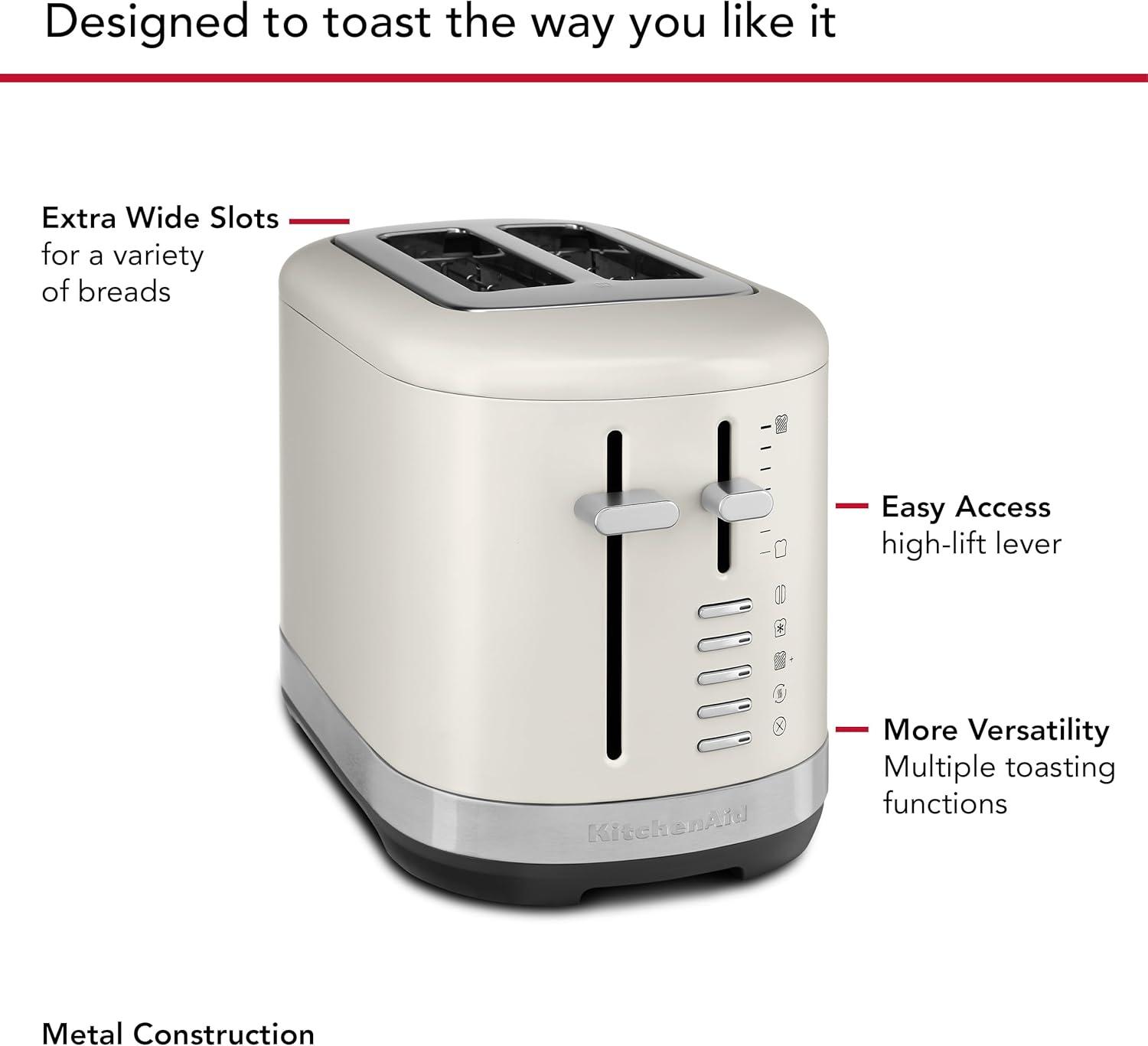Make everyday simply delicious and easily toast your favorite breads, bagels and more with ease. This KitchenAid 2 Slice Toaster features extra-wide slots to toast a variety of shapes and sizes, including homemade or craft breads. For added convenience the adjustable shade control, from light to dark, ensures you'll have your toast just the way you like it, every time. It's built to last and the durable metal design adds style to your countertop.