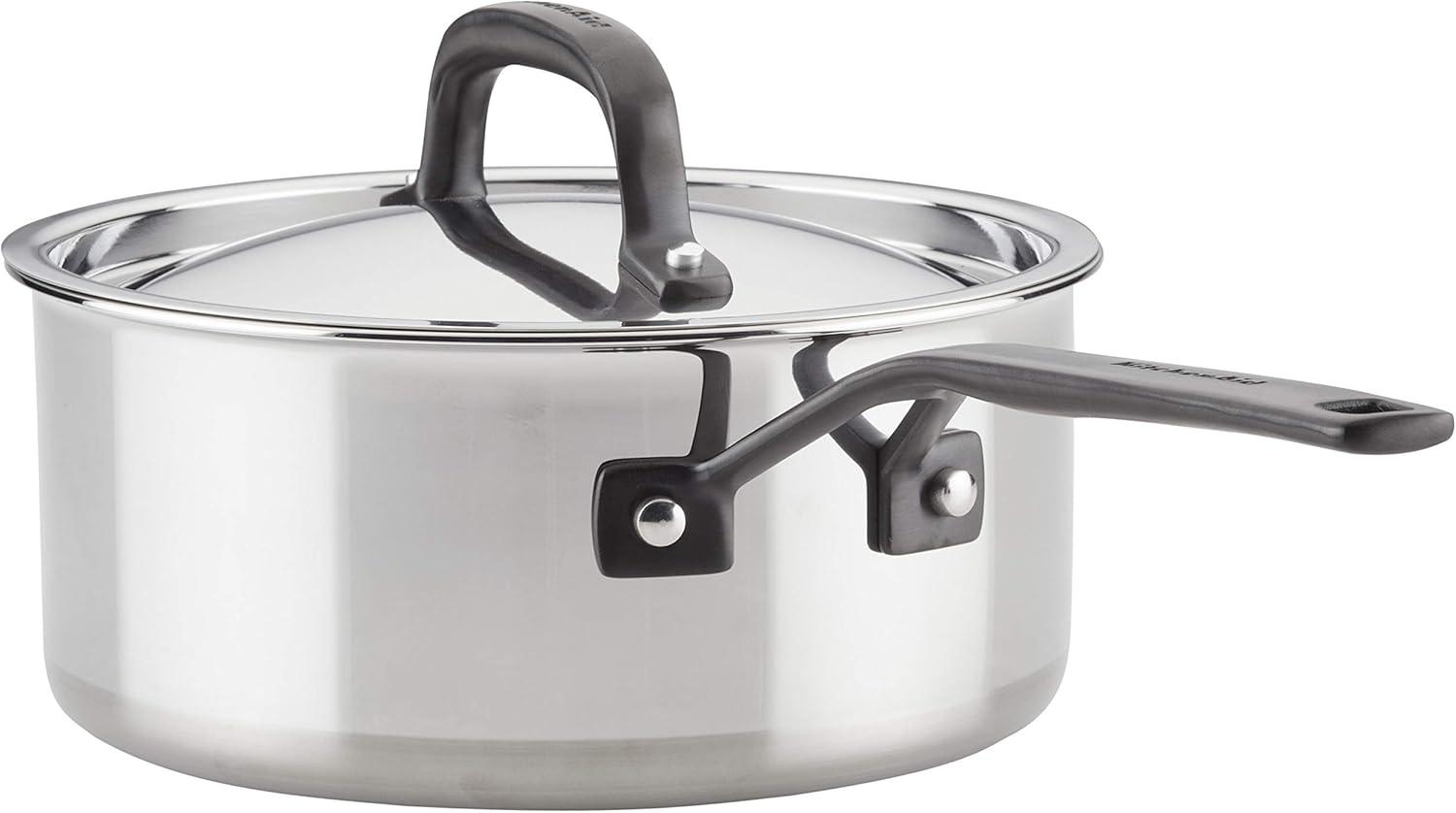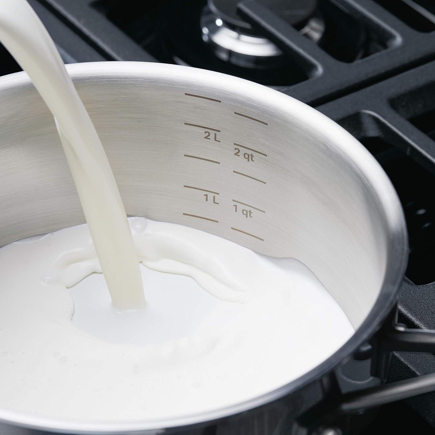Build layers of flavor with KitchenAid 5-Ply Clad Stainless Steel Cookware designed for precision cooking with exceptional base-to-rim heat conduction. Crafted from 5-layers of heat conductive metal throughout, these heavy-gauge induction pots and pans are built to fuel endless possibilities in the kitchen while providing superior heat retention. Etched measuring marks on the stockpot and saucepans assist with the adding of ingredients for preparing precise recipes like a delicate bechamel sauce. Stainless steel lids lock in heat and flavor to get the most out of every ingredient, and sealed rims prevent corrosion, allowing for pots and pans to be truly dishwasher safe. Broiler and oven safe to 500°F for versatility, freedom, and creative cooking.