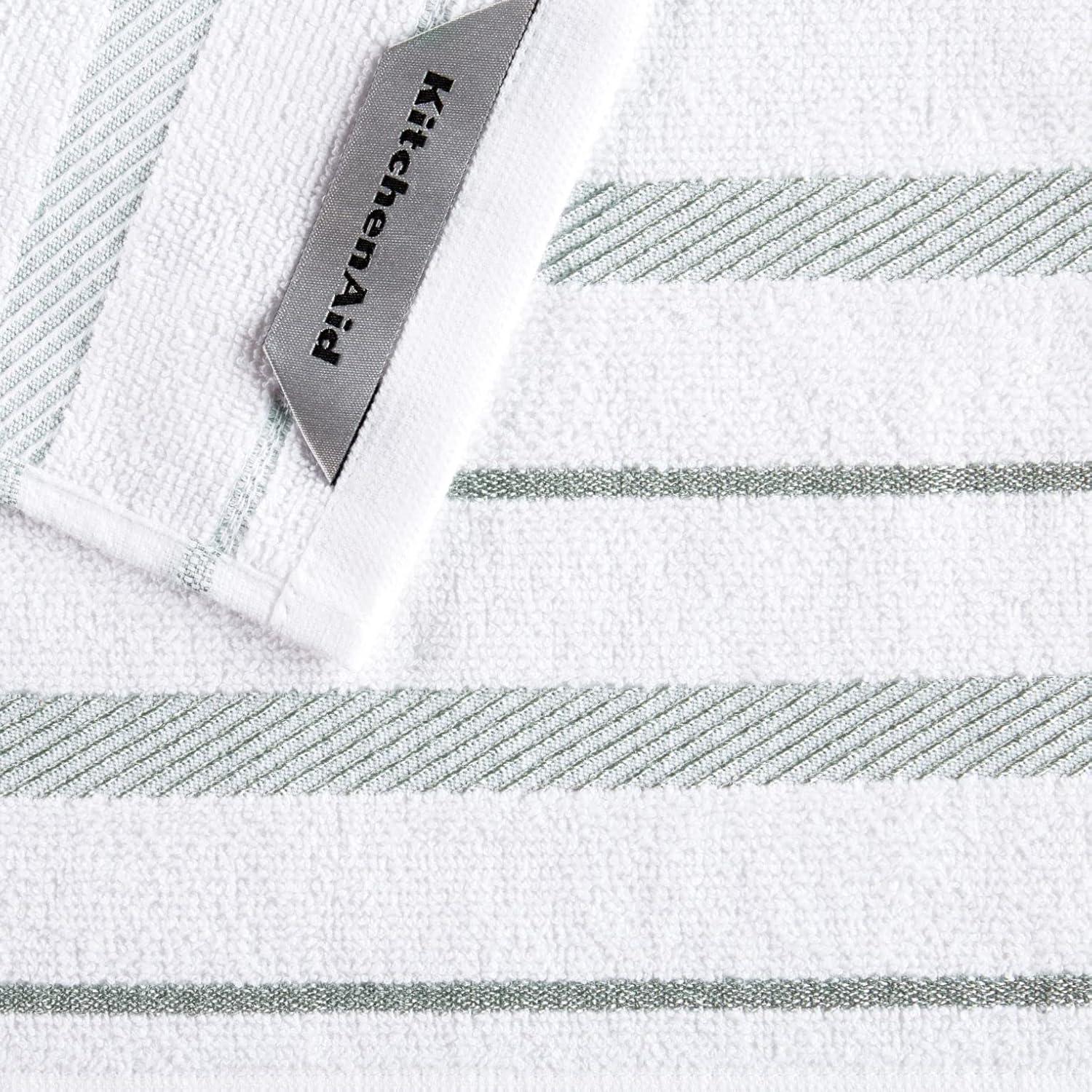 Get your kitchen chores done in classic style with the KitchenAid Albany Stripe dish cloth 8 Piece Set. The set includes four solid aqua dish cloths and four aqua and white striped cloths that measure 12 inches wide by 12 inches long. The solid dish cloth is made with highly absorbent cotton and works well for wiping splatters and spills, cleaning countertops, and drying dishes since it is non-abrasive and safe for use on most kitchen surfaces. The striped dish cloth is made with a cotton-polyester blend for durability and versatility use while tidying up. These soft dish cloths are perfect for everyday use including daily household chores. Perfect for drying and cleaning glassware, cookware, flatware and more. New dish cloth makes the perfect gift for a housewarming or hostess gift. Easy clean machine washable. Made in India.