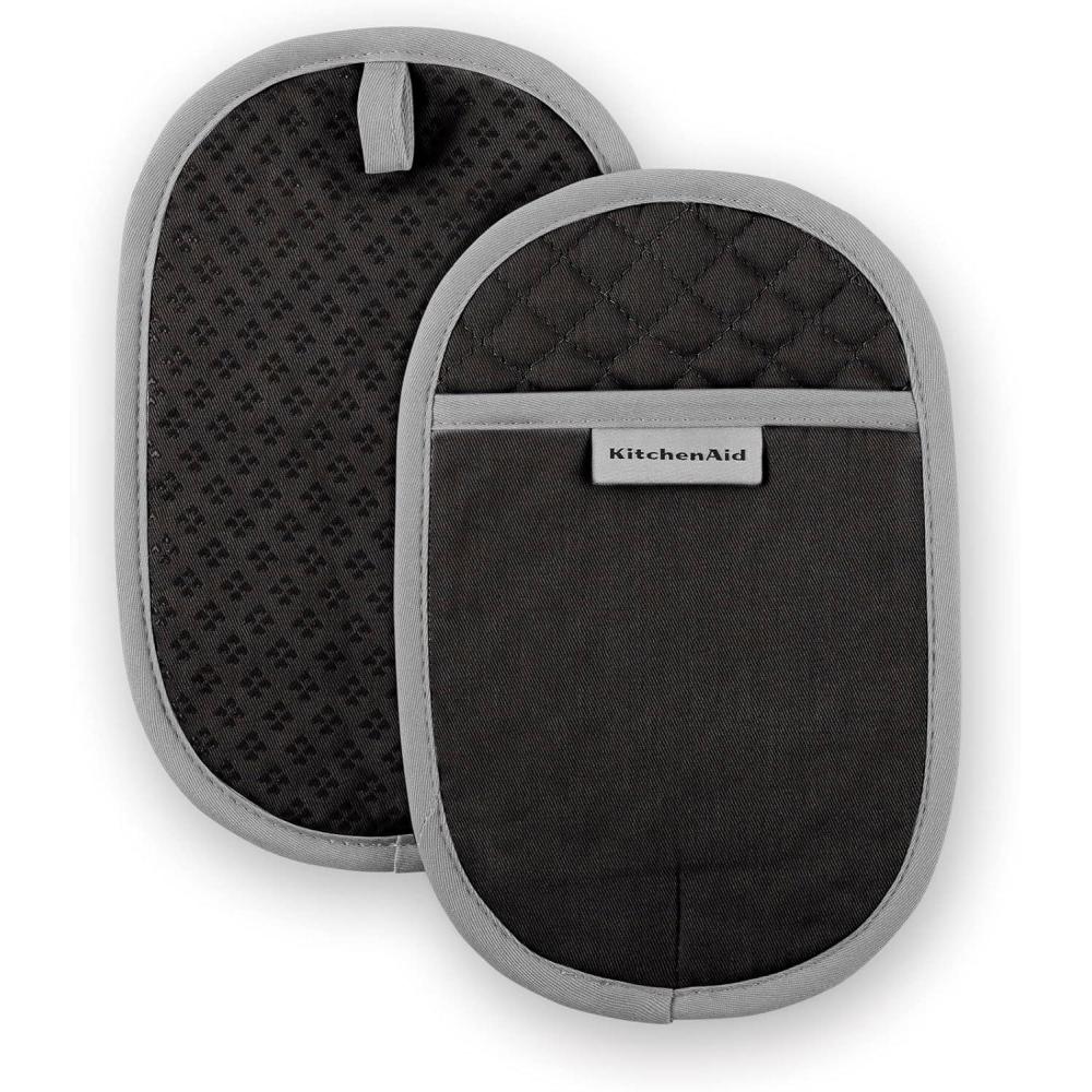 Use the Kitchen Aid Asteroid Pot Holders 2 Pack to protect hands from the heat when handling hot pots, pans, and dishes. These oval pot holders each measure 6. 5 inches wide by 10 inches long and feature a slide pocket for your hand for easy on and off use while you're cooking and baking. The heavy-duty, 100 percent cotton fabric offers comfort, flexibility, and insulation. Textured, silicone print grips on the pot holders are heat resistant and also ensure a more firm and secure grip when handling hot cookware. The matching pot holders feature a convenient hanging loop to easily display or store them when not in use. They are easy to clean and machine washable for easy care. Use your Kitchen Aid Asteroid Pot Holders 2 Pack along with coordinating kitchen accessories from Kitchen Aid including oven mitts and kitchen towels for a complete set of Kitchen Aid kitchen essentials! Each item is sold separately. Made in China.