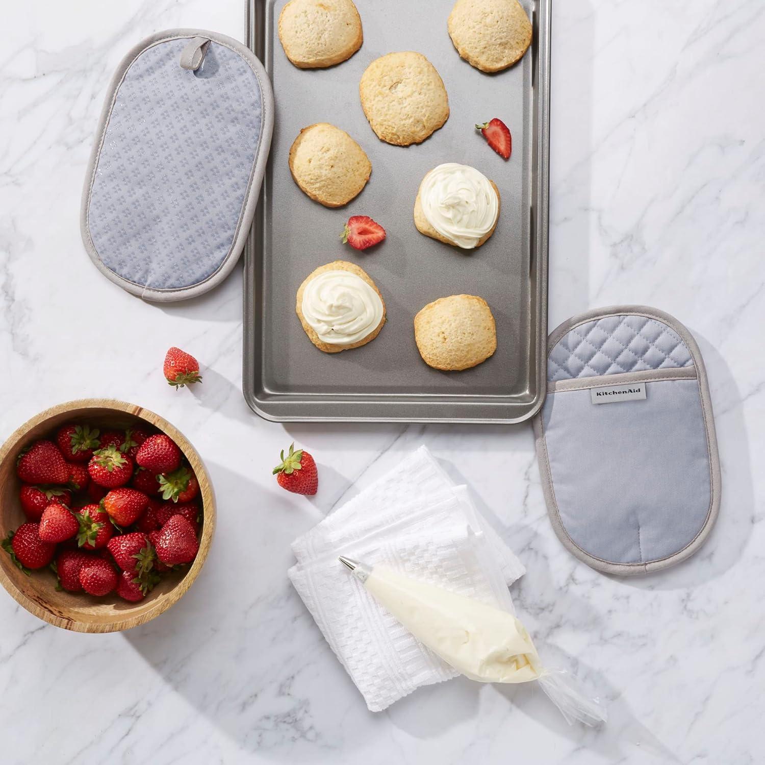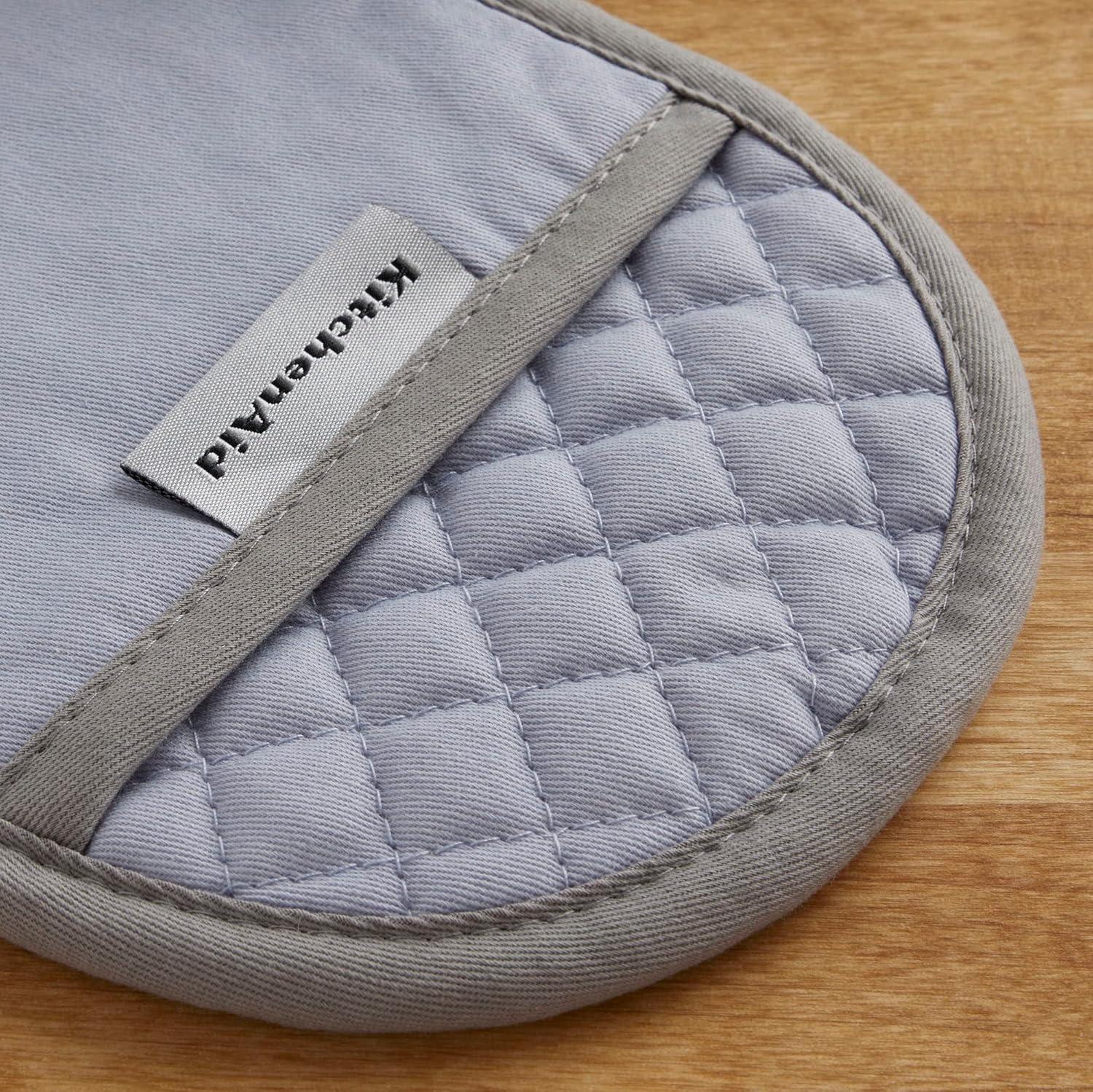 Use the Kitchen Aid Asteroid Pot Holders 2 Pack to protect hands from the heat when handling hot pots, pans, and dishes. These oval pot holders each measure 6. 5 inches wide by 10 inches long and feature a slide pocket for your hand for easy on and off use while you're cooking and baking. The heavy-duty, 100 percent cotton fabric offers comfort, flexibility, and insulation. Textured, silicone print grips on the pot holders are heat resistant and also ensure a more firm and secure grip when handling hot cookware. The matching pot holders feature a convenient hanging loop to easily display or store them when not in use. They are easy to clean and machine washable for easy care. Use your Kitchen Aid Asteroid Pot Holders 2 Pack along with coordinating kitchen accessories from Kitchen Aid including oven mitts and kitchen towels for a complete set of Kitchen Aid kitchen essentials! Each item is sold separately. Made in China.