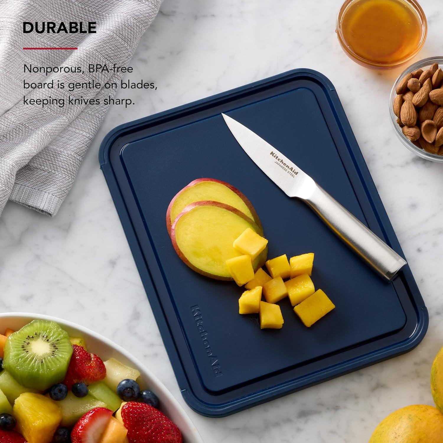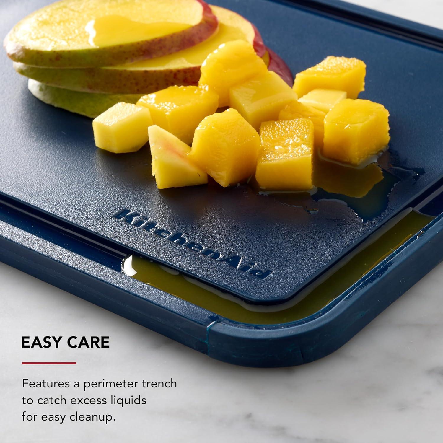This KitchenAid Classic 8×10 plastic cutting board is the ideal size for everyday food prep tasks. This nonslip cutting board is expertly designed to provide an exceptional experience, whether for cutting, slicing, dicing, mincing, or chopping. This plastic cutting board is designed with nonslip edges for stability and control. Made and engineered to maintain shape over time, this board is gentle on knives for long-lasting durability. This cutting board features a perimeter trench to collect excess liquids and is dishwasher safe for easy cleanup.