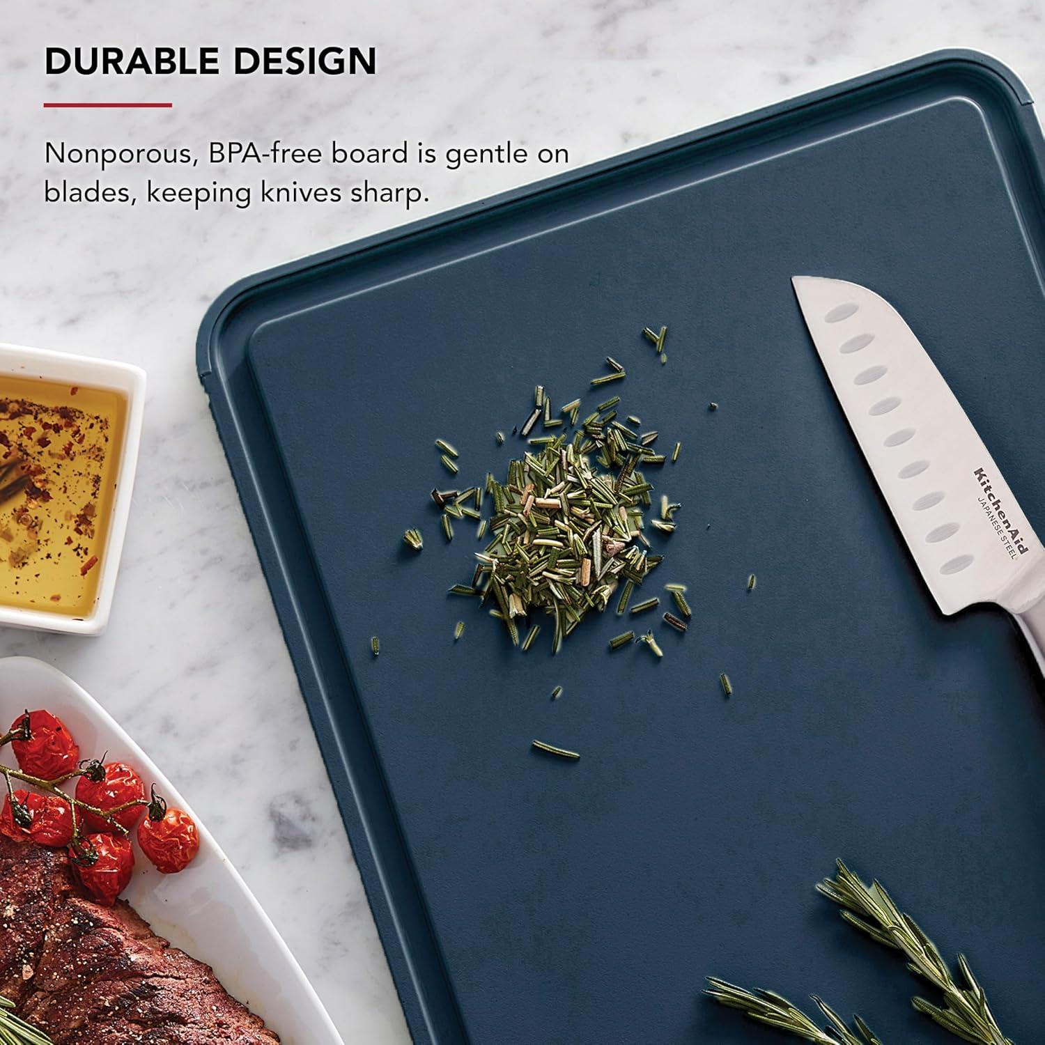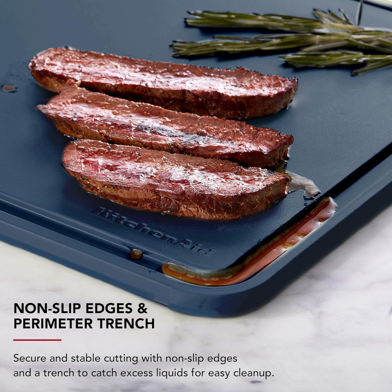 NON-SLIP EDGES & PERIMETER TRENCH: This KitchenAid cutting board offers a secure base for all your culinary tasks, featuring non-slip edges and a perimeter trench for added safety and convenience.