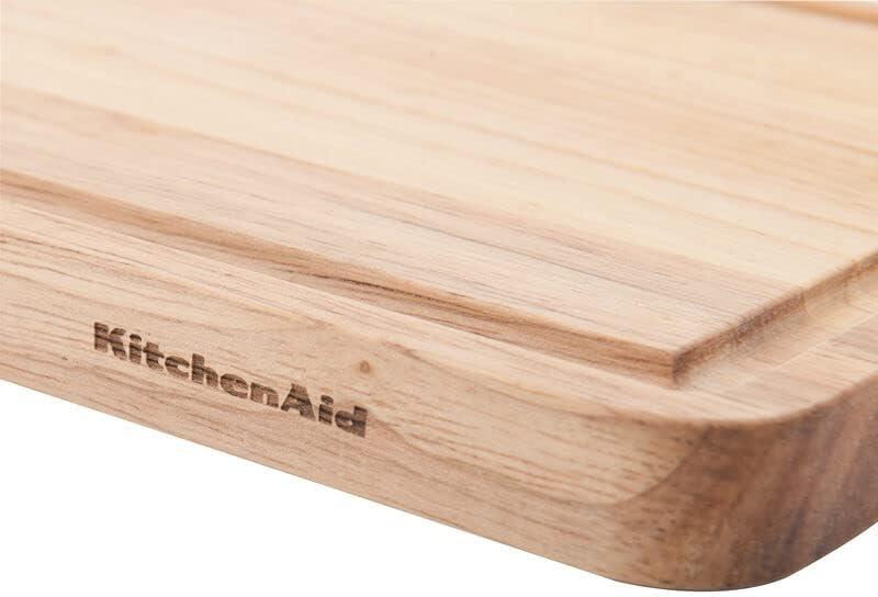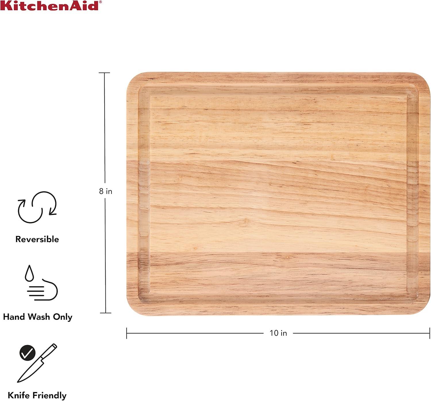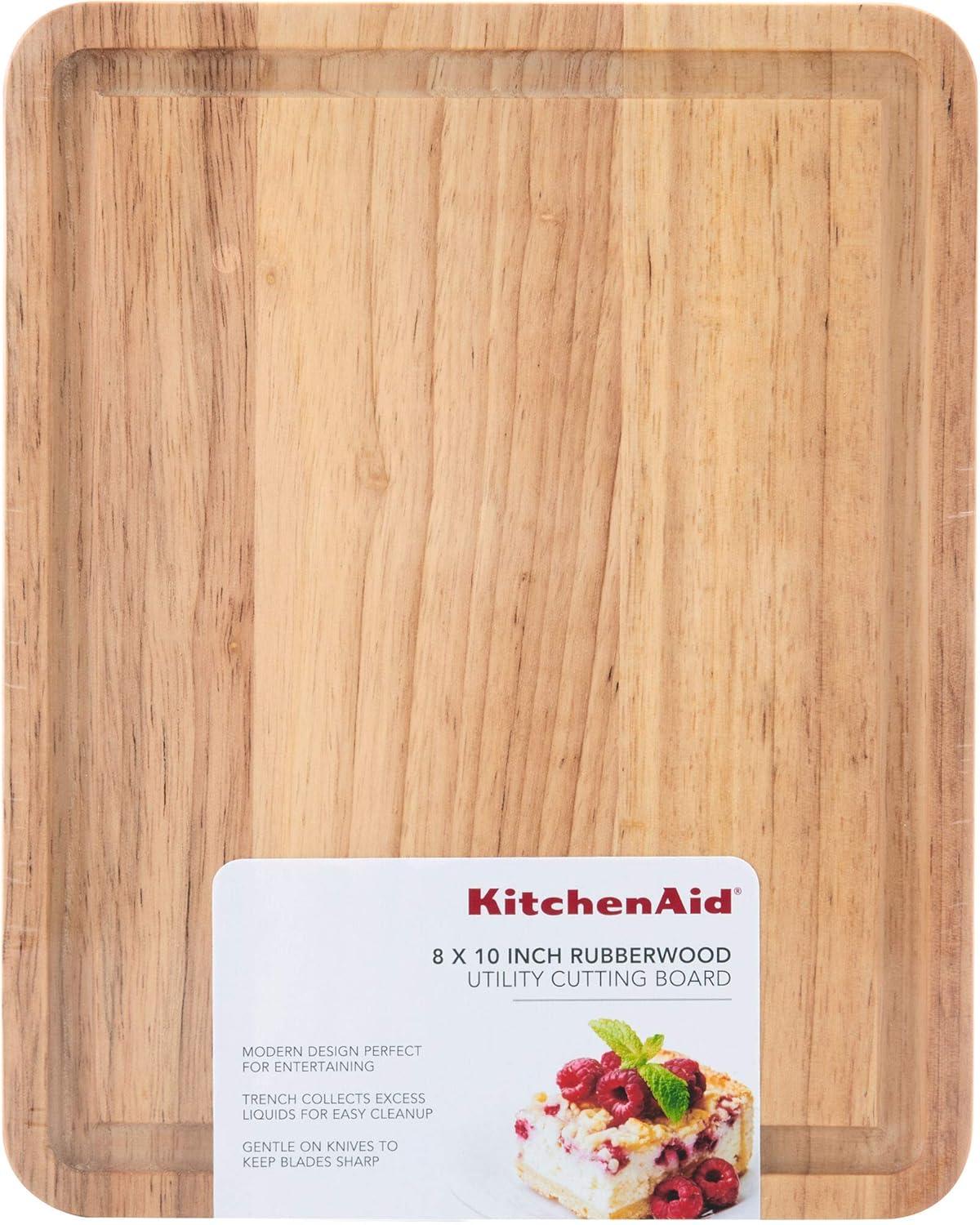 This KitchenAid® Classic 8 x 10 wood utility board is expertly designed to provide an exceptional experience, whether for cutting, slicing, dicing, mincing, or chopping. This utility board features a perimeter trench to catch excess liquids for easy cleanup. Crafted from rubberwood, this board is engineered to maintain its shape over time for long-lasting durability and is gentle on knives. Hand washing with warm water and a mild detergent is recommended. Dry immediately.