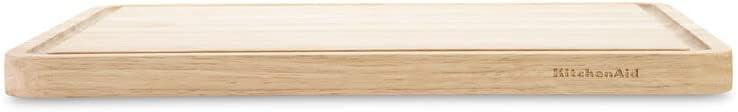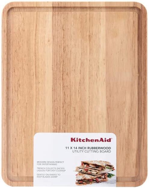 This KitchenAid® Classic 8 x 10 wood utility board is expertly designed to provide an exceptional experience, whether for cutting, slicing, dicing, mincing, or chopping. This utility board features a perimeter trench to catch excess liquids for easy cleanup. Crafted from rubberwood, this board is engineered to maintain its shape over time for long-lasting durability and is gentle on knives. Hand washing with warm water and a mild detergent is recommended. Dry immediately.
