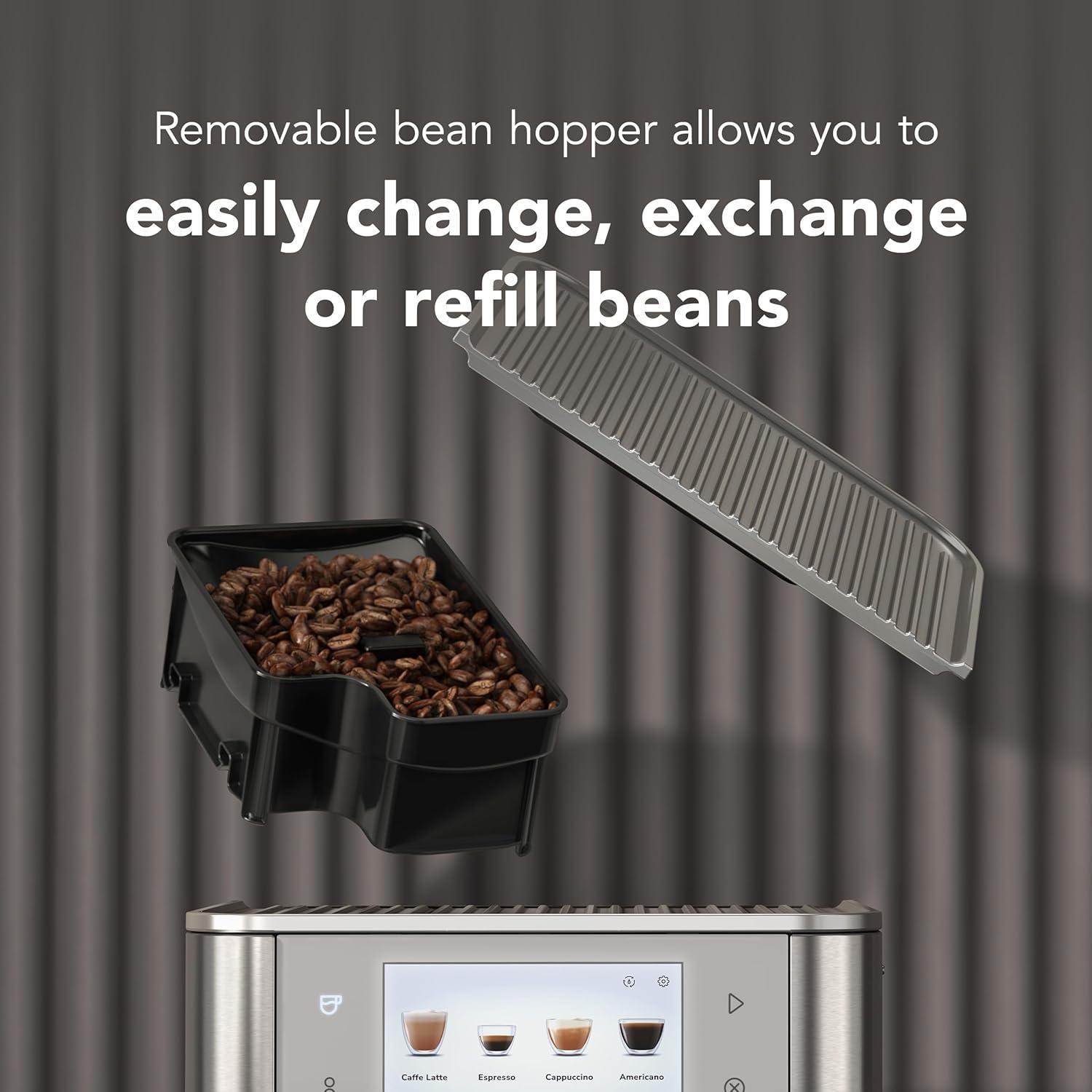Removable bean hopper allows you to simply twist and lift to easily remove the bean hopper to empty, exchange or refill with fresh beans to suit your taste