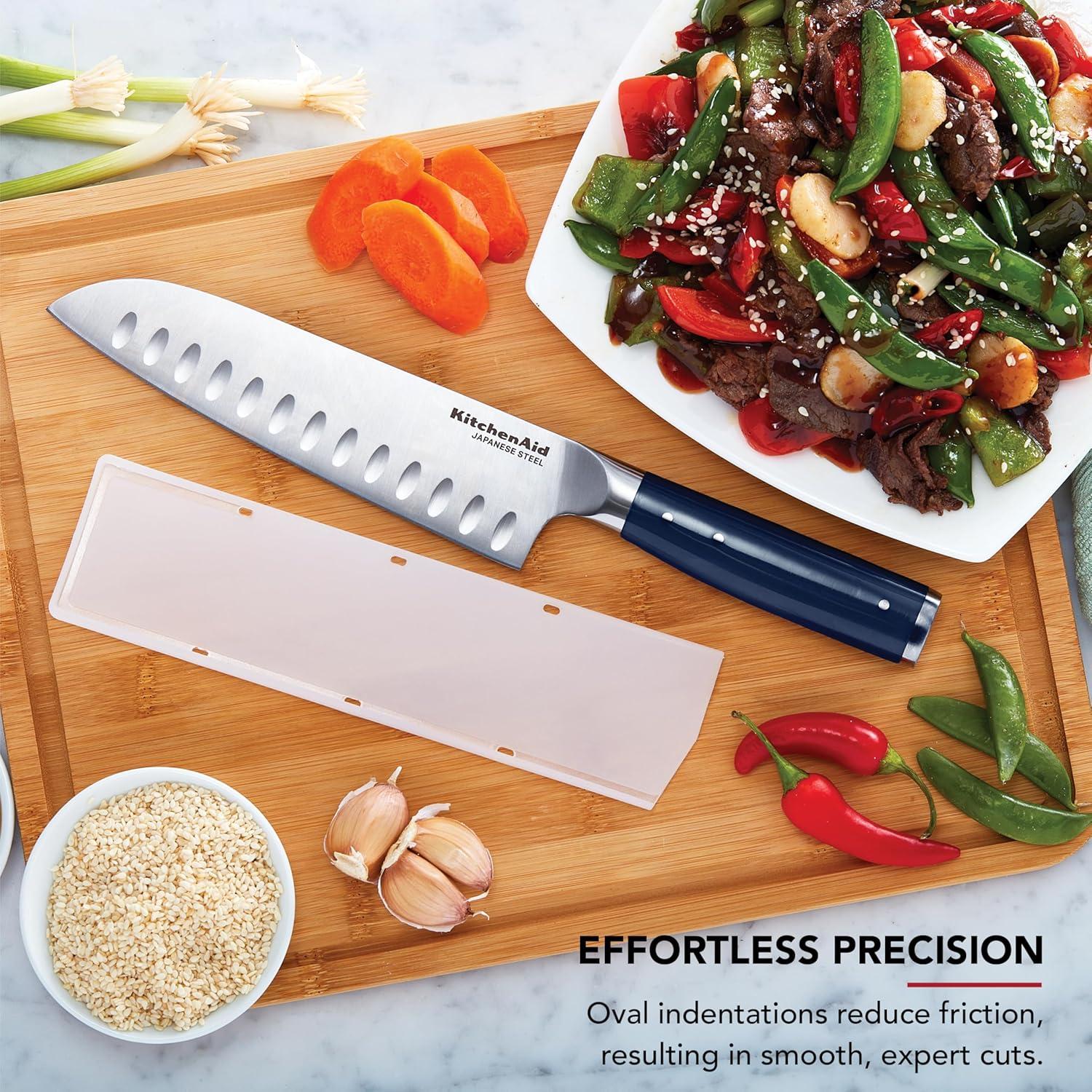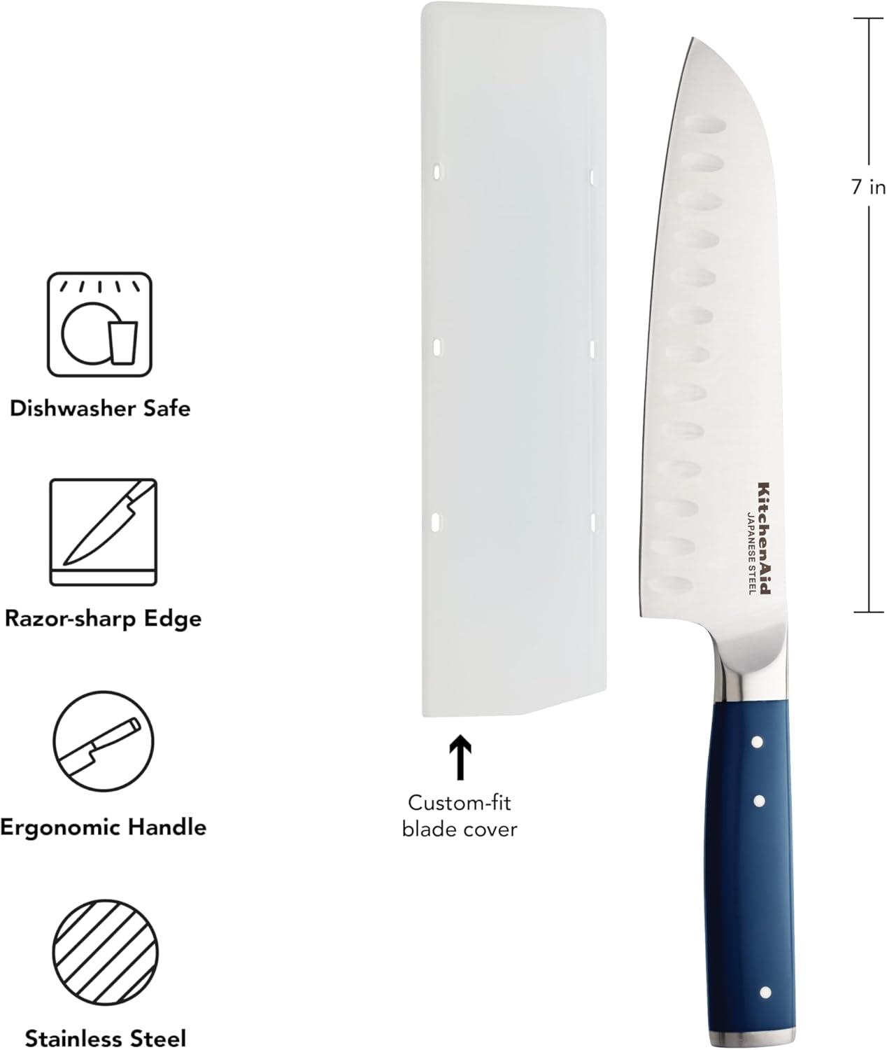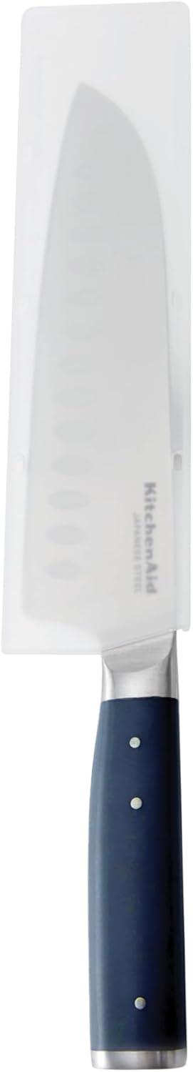 The KitchenAid® 7-inch Santoku Knife in ink blue is a must-have for everyday meal prep. The oval indentations on the blade are specially designed to prevent foods from sticking while you slice, making it perfect for chopping and dicing vegetables. This forged knife is expertly crafted using semi-polished, high-carbon Japanese steel, hardened and tempered to provide a long-lasting edge for a professional, quality cut every time. The Eastern-style ergonomic handle, in a striking ink blue, is expertly engineered with a triple-riveted pin design, providing optimal control for everyday use and accentuated with a stainless steel endcap. The ink blue handle adds a modern, stylish touch to your kitchen. Includes a custom-fit blade cover for secure, safe storage. KitchenAid® knives are top-rack dishwasher safe, but to extend the life of your cutlery, hand washing is recommended. Dry immediately.
