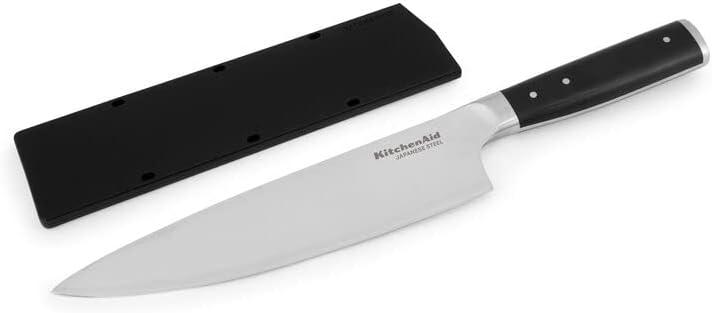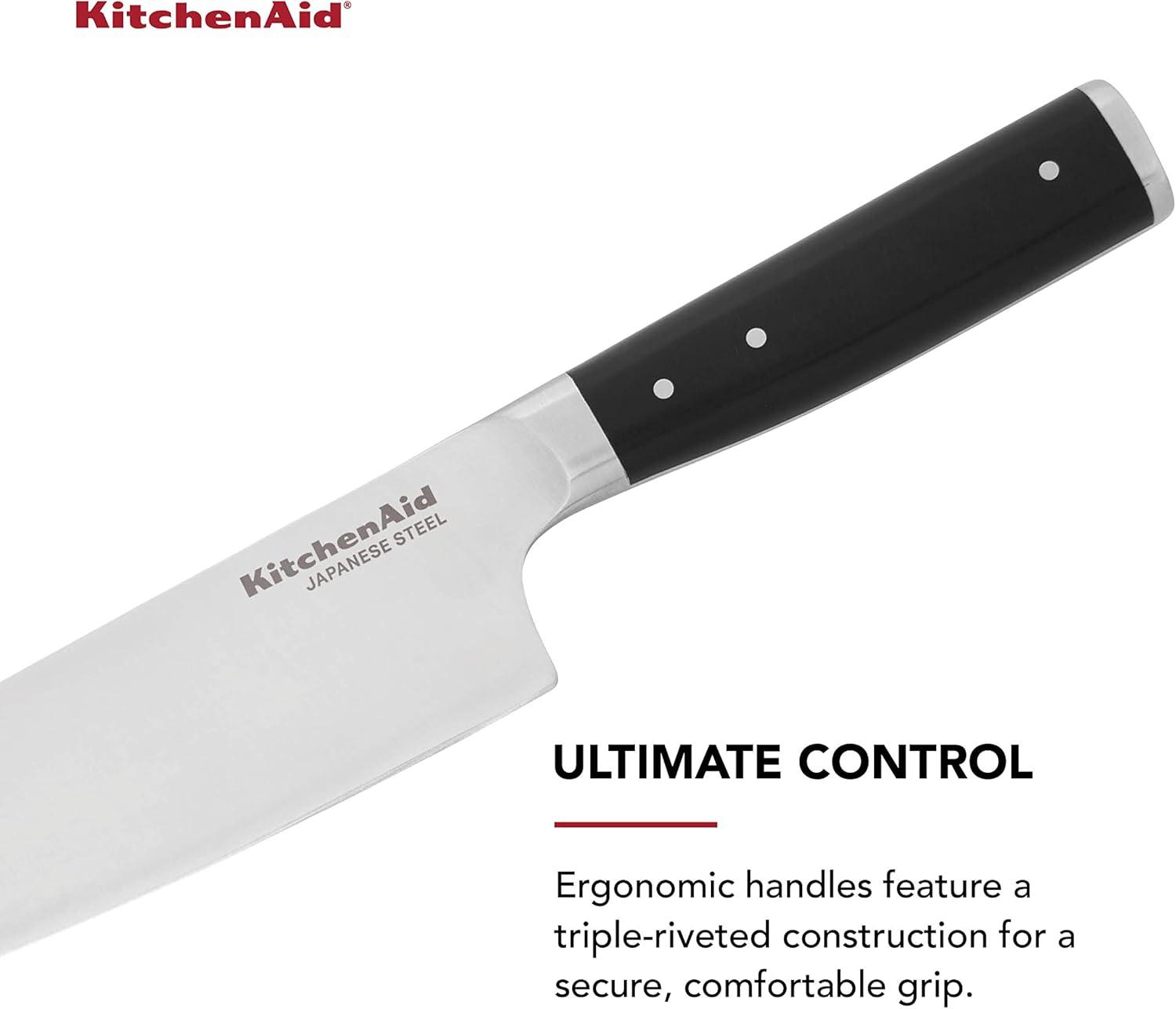 The KitchenAid 5-inch santoku knife is a must have for everyday meal prep. The oval indentations on the blade are specially designed to prevent foods from sticking while you slice, making it perfect for chopping and dicing vegetables. This forged knife is expertly crafted using semi-polished, high-carbon Japanese steel, hardened and tempered to provide a long-lasting edge for a professional, quality cut every time. This KitchenAid® knife features an eastern-style ergonomic handle with a triple-riveted pin design that provides optimal control for everyday use. This handle is expertly engineered with a textured finish for a comfortable grip and accented with a stainless steel endcap. Includes a custom-fit blade cover for secure, safe storage. KitchenAid® knives are top rack dishwasher safe. To extend the life of your cutlery, hand washing is recommended. Dry immediately.