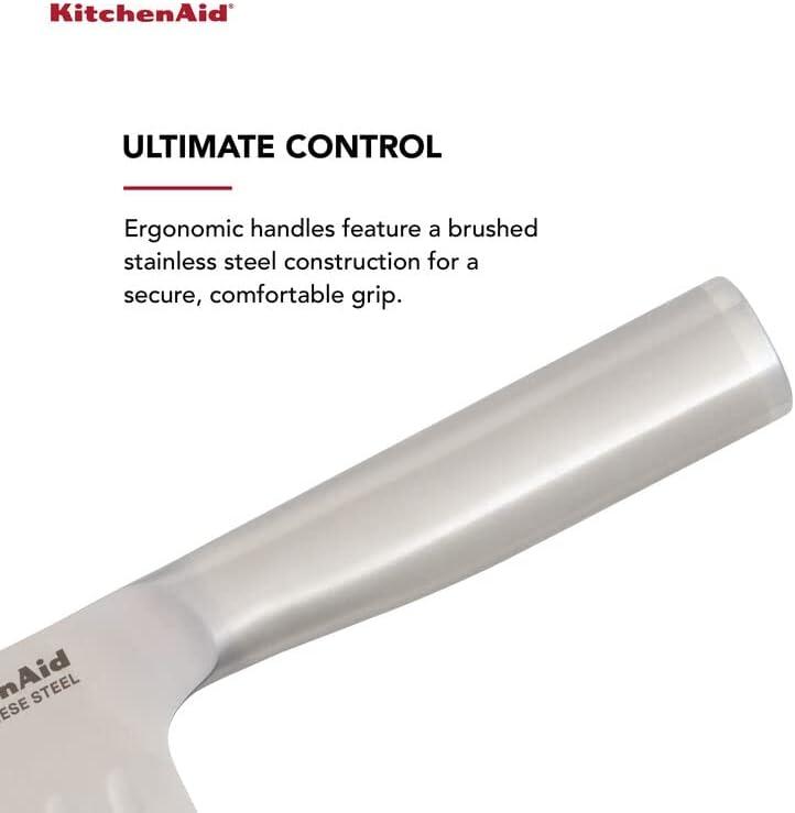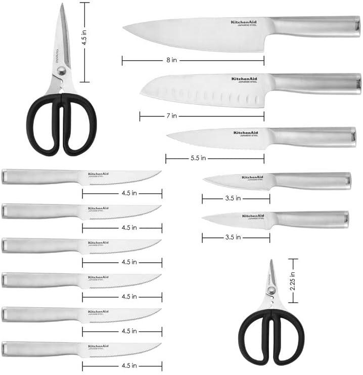 This KitchenAid Gourmet 15-piece Forged cutlery set includes all the essential knives needed to perform everyday food prep tasks such as slicing, cutting, chopping, mincing, trimming, and more. The set includes an 8-inch chef knife, 8-inch slicing knife, 5.5-inch serrated utility knife, 4.5-inch fine-edge utility knife, 5-inch santoku knife, 3.5-inch serrated paring knife, 3.5-inch paring knife, six 4.5-inch steak knives, utility shear and storage block with a built-in sharpener. Forged blades are crafted using semi-polished, high-carbon imported Japanese steel, hardened and tempered to provide a long-lasting edge for a professional, quality cut every time. These KitchenAid knives feature Eastern-style ergonomic handles that provide optimal control for everyday use. The handles are expertly engineered in a satin stainless steel finish for a comfortable grip, and accented with a polished endcap. The contemporary wood storage block complements any kitchen and features a built-in sharpener for effortless sharpening. KitchenAid knives are top-rack dishwasher safe. To extend the life of your cutlery, hand washing is recommended. Dry immediately.