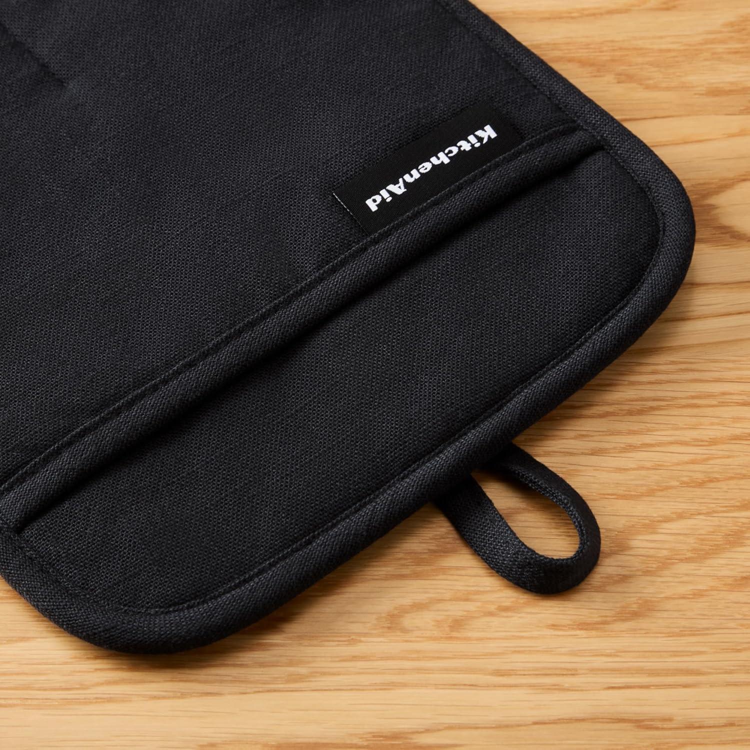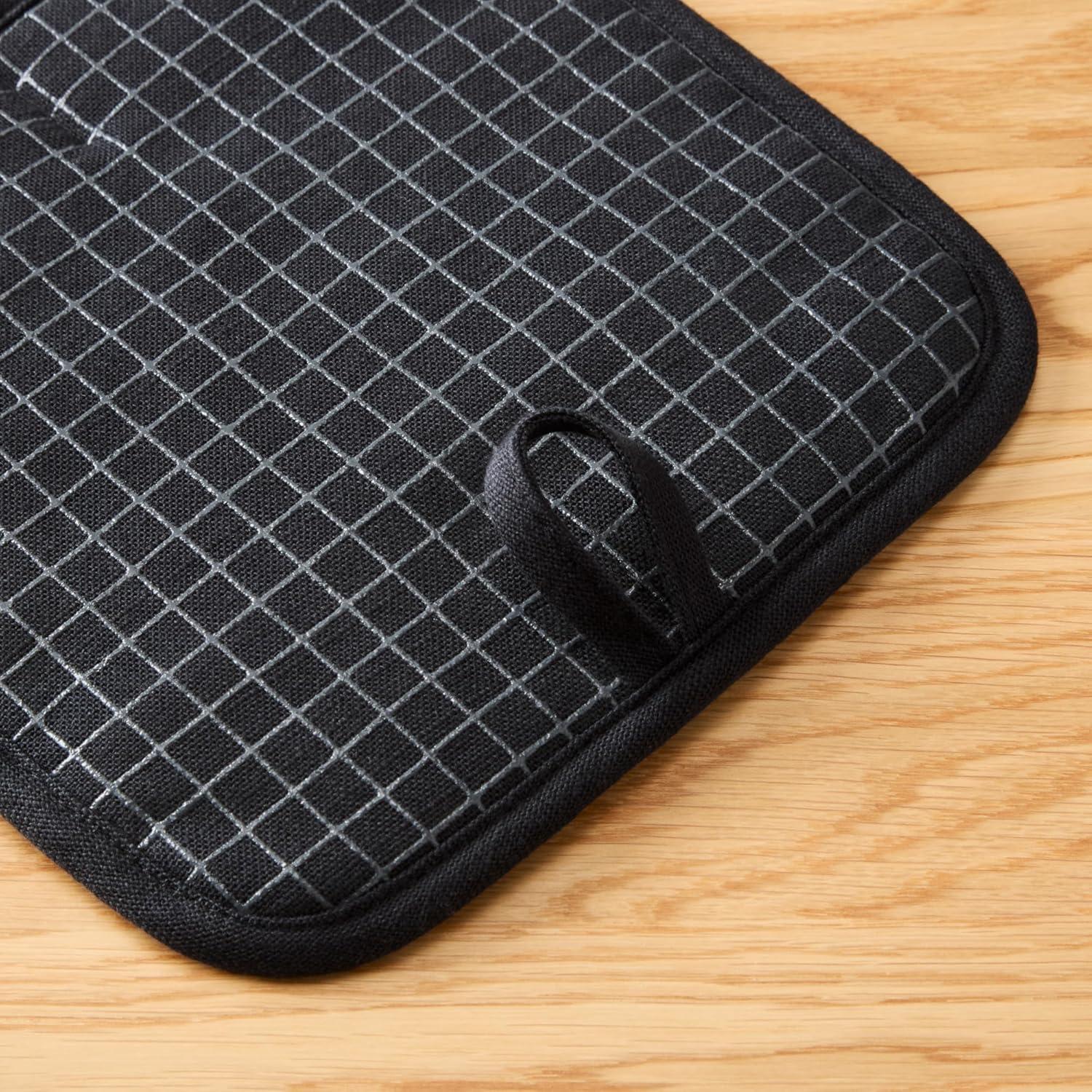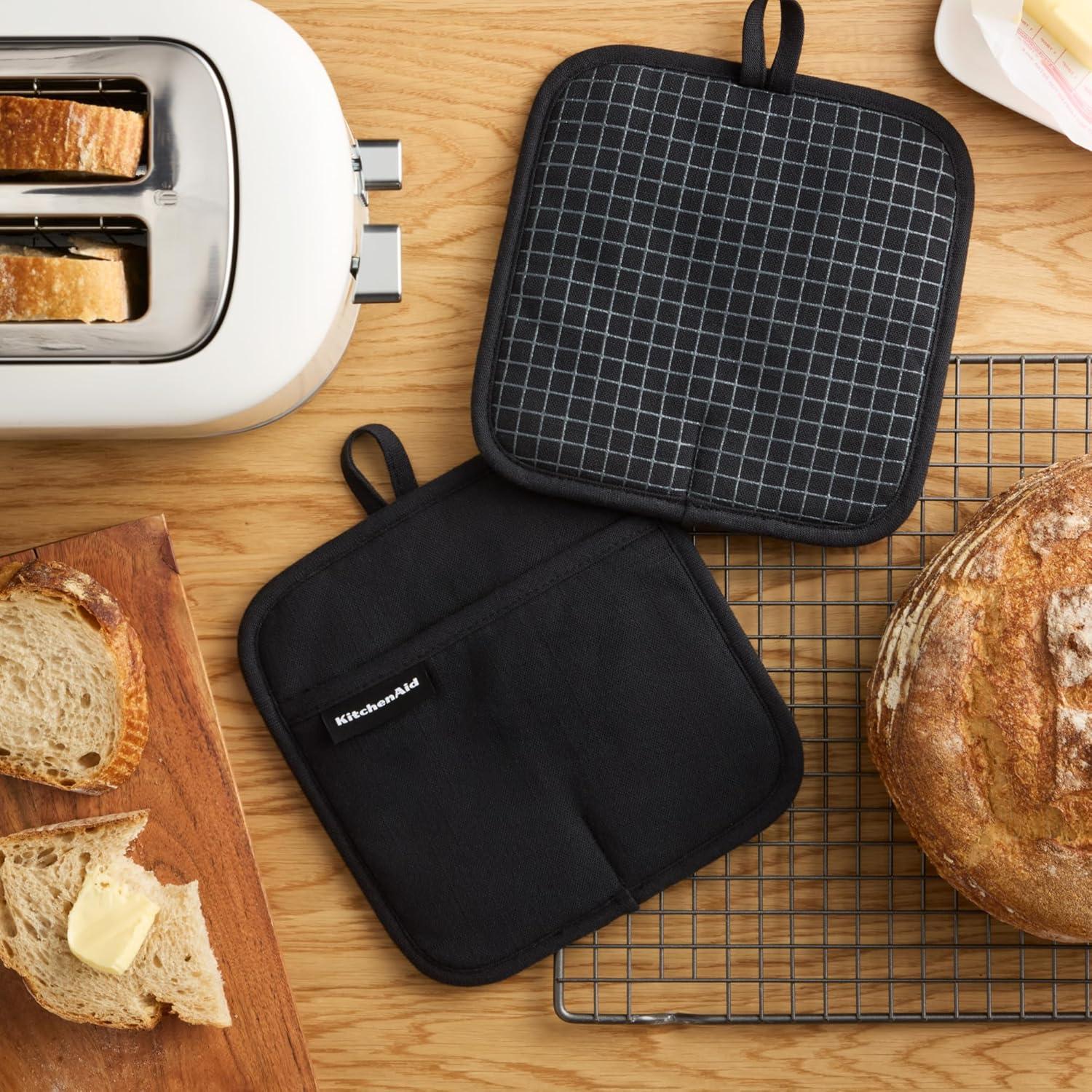 KITCHENAID Gourmet Series Gridlines Pot Holders 2-Pack Set, Heat Resistant up to 600°F, Soft Silicone Grip, Magnetic Cuff, Ink Blue, 8″x8″(Matte Black)