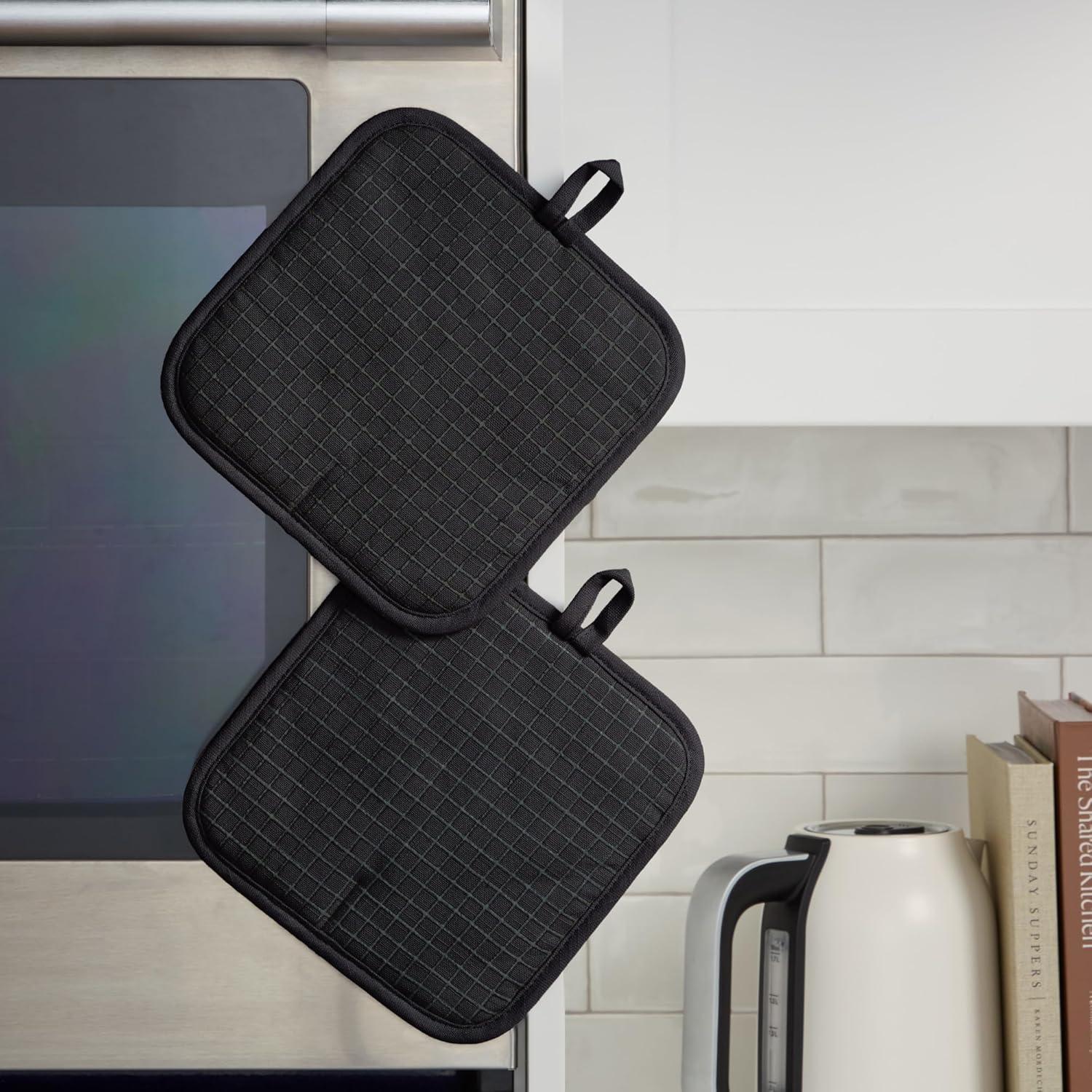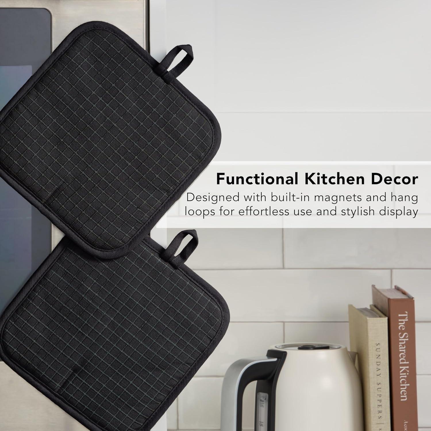 Stylish & Functional Design Details: crafted with a 100% cotton shell, thick polyester fill, and silicone detailing, these pot holders feature a modern design with built-in magnets and hang loops for easy display and storage
