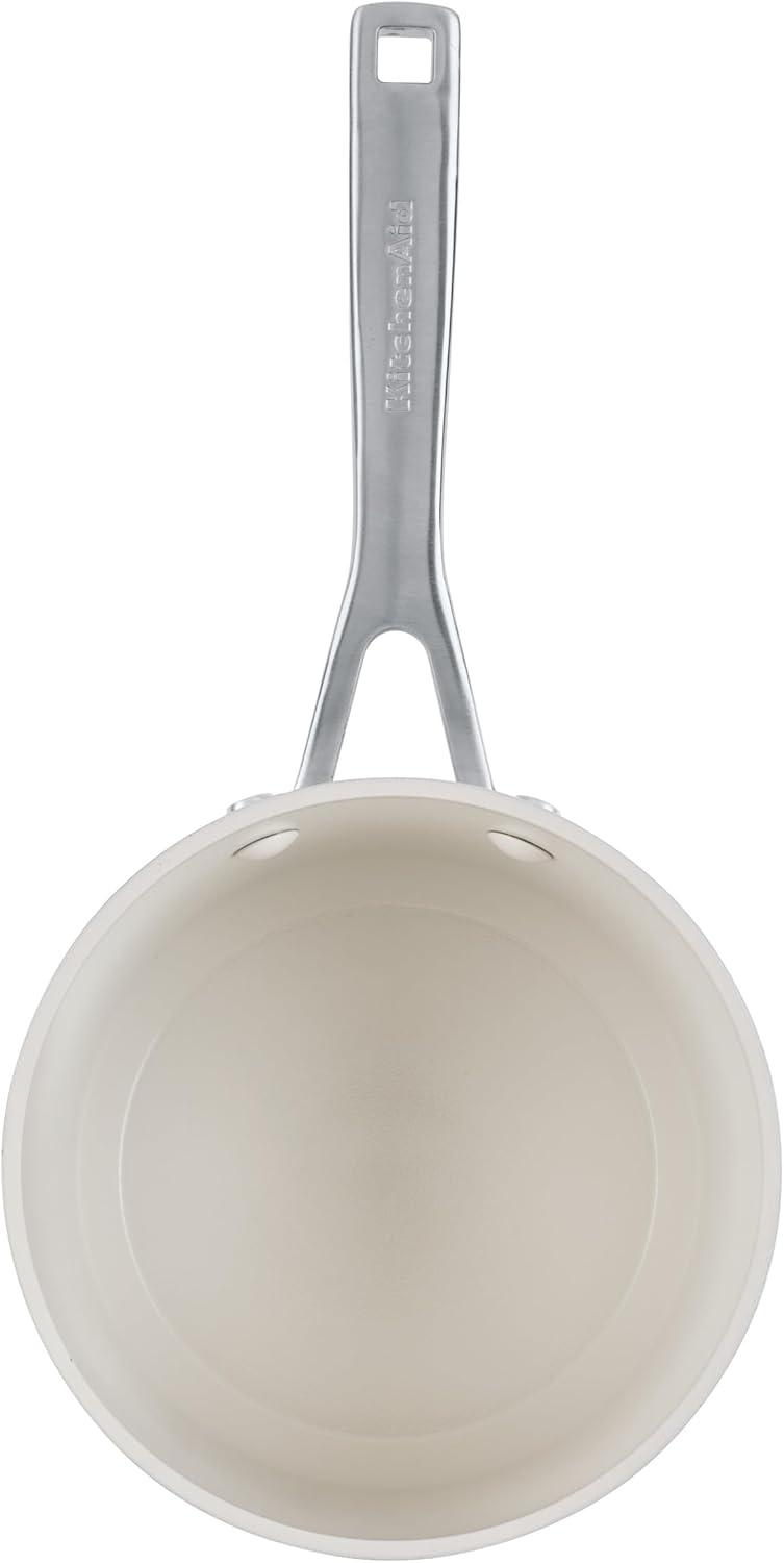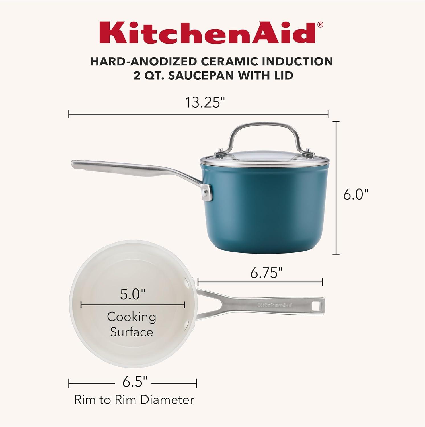 Elevate everyday cooking with the KitchenAid Hard-Anodized Ceramic Induction 2-Quart Saucepan with Lid, where contemporary style meets incredible nonstick performance—made without PFAS*. Cook healthier with durable ceramic nonstick, which is designed to release foods easily, requiring less oil to keep food from sticking. This saucepan is 8x stronger than standard aluminum, ensuring exceptional durability and heat conduction. Induction-ready performance, shatter-resistant glass lid, and double-riveted stainless steel handle add convenience, confidence, and control. Designed for effortless stovetop creativity and beautiful kitchen-to-table presentations, this versatile saucepan is here to help you transform meals into authentic moments of connection and inspiration. Oven safe up to 500 degrees F (lid to 350) and dishwasher safe for easy cleanup. *Product design does not involve intentionally adding to the cooking surface any of these substances which may otherwise be present in the environment.