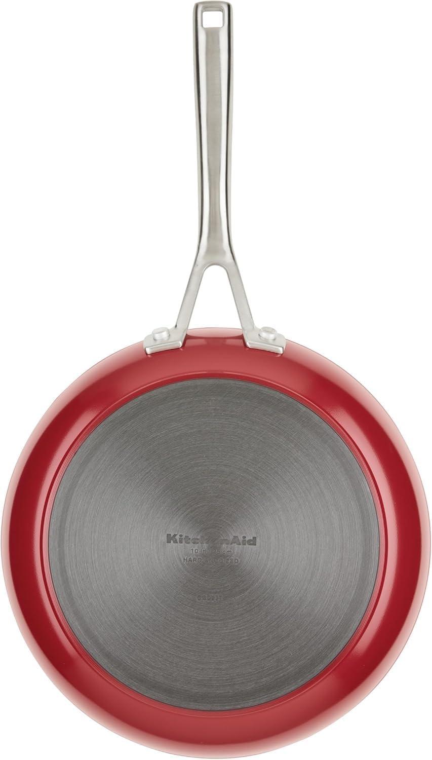 Made for everyday cooking and beautiful kitchen-to-table presentations, KitchenAid Hard Anodized Ceramic Cookware is finished with an easy-clean, ceramic nonstick interior and a durable hard-anodized exterior, crafted with thick, forged aluminum bases and rims to deliver excellent heat conduction and durability. This 9-piece set of kitchen pots and pans is 8x harder than aluminum for lasting performance and includes three frying pans, two saucepans, and a deep stockpot. Bring standout recipes to life in stylish cookware finished in trend-right colors to suit the contemporary kitchen. Practical features designed for convenience and control include shatter resistant, tempered glass lids and double-riveted stainless steel handles. The long-lasting ceramic nonstick means you'll need less oil (for healthier cooking) and enjoy fast and easy cleanup of sticky and saucy recipes. Oven safe to 500ºF (glass lids to 350ºF), this performance-worthy and presentation-ready cookware set will have your kitchen equipped to make the most of any meal.