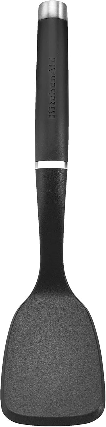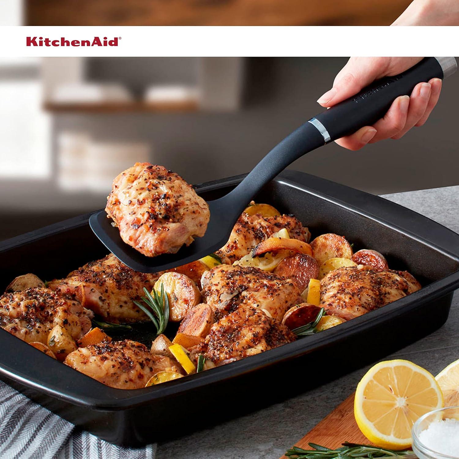 This KitchenAid nylon Short turner is designed for greater control when lifting and turning foods, like pancakes and grilled cheese. The nylon turner is safe to use on all cookware, including non-stick and is heat resistant to 450°f/232°c. The turner's head is constructed of 30% glass reinforced nylon, which makes it strong and durable for use in the kitchen. The glossy ABS handle features a debossed logo, as well as an ABS satin chrome plated bolster and end cap. Dishwasher safe for easy cleanup. One year hassle-free replacement and lifetime limited .