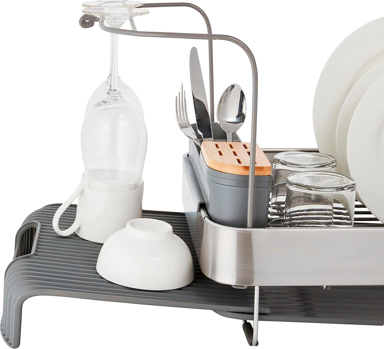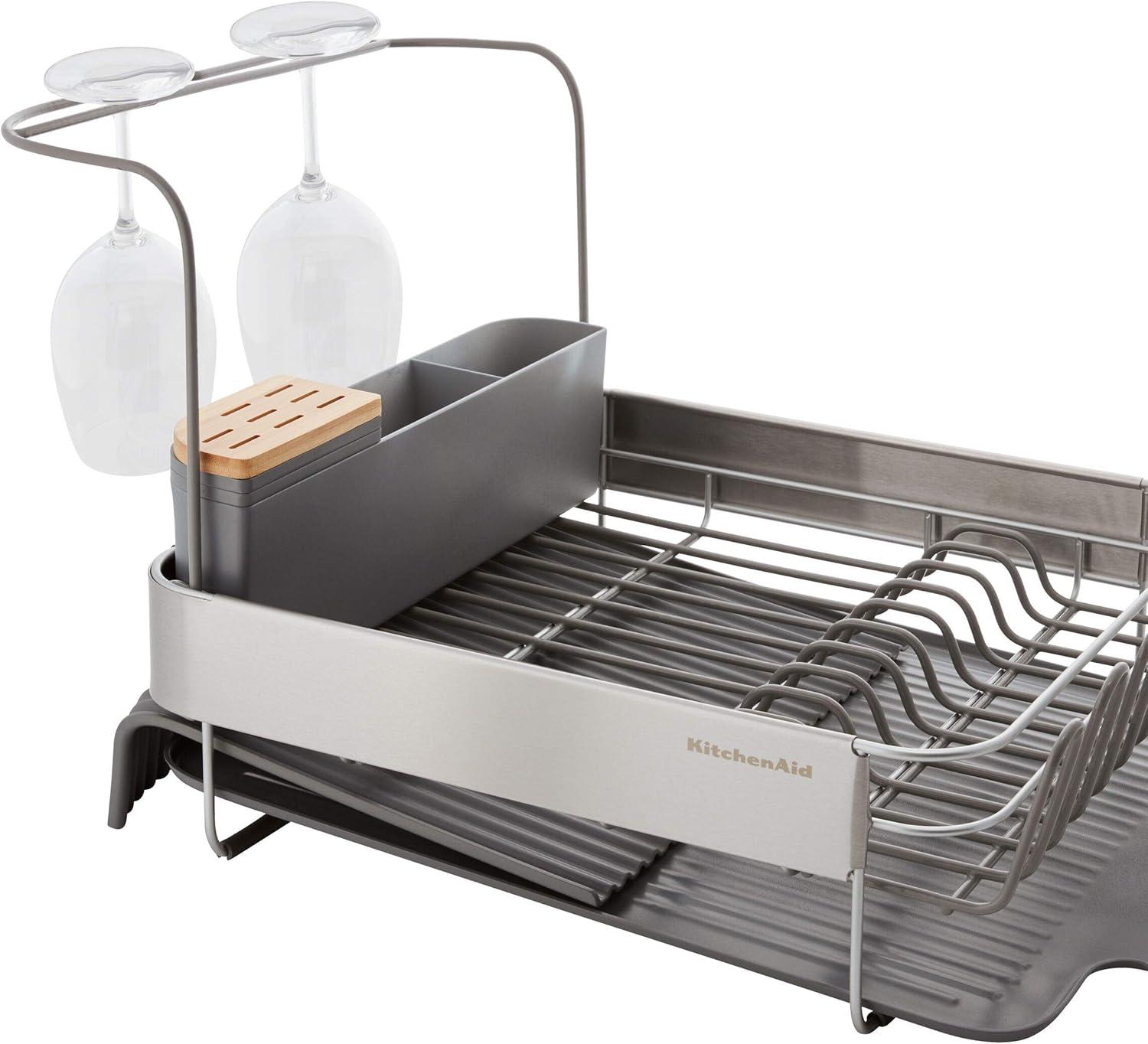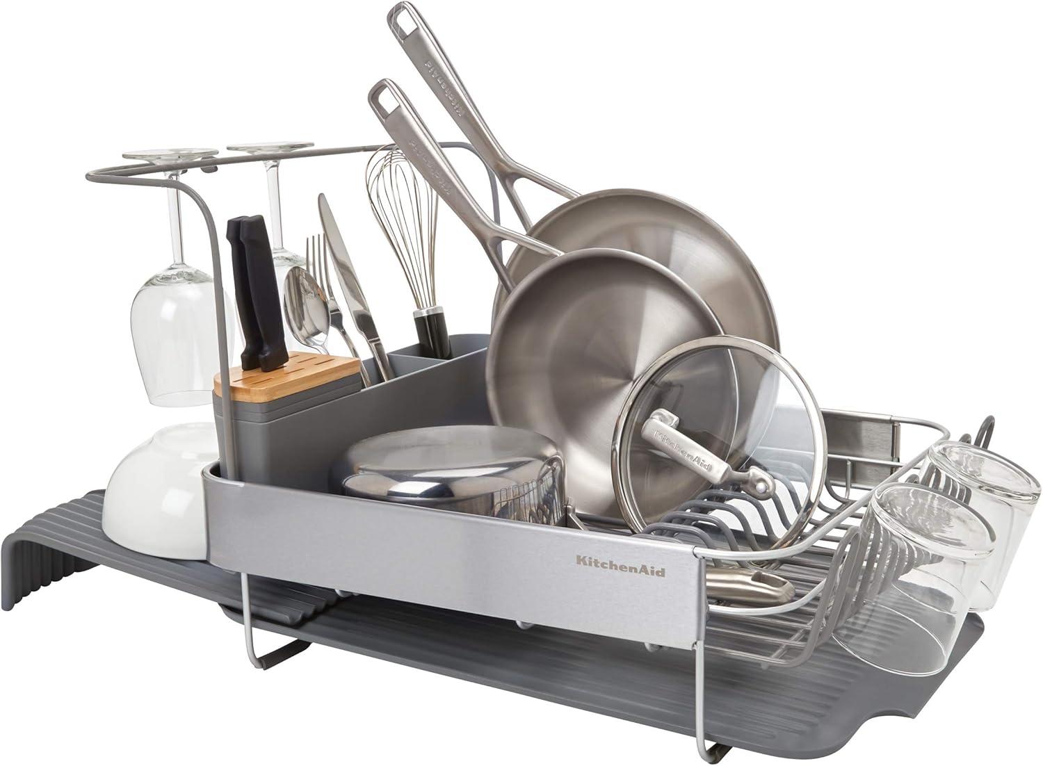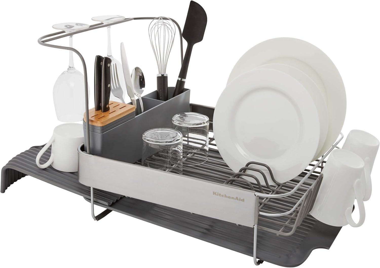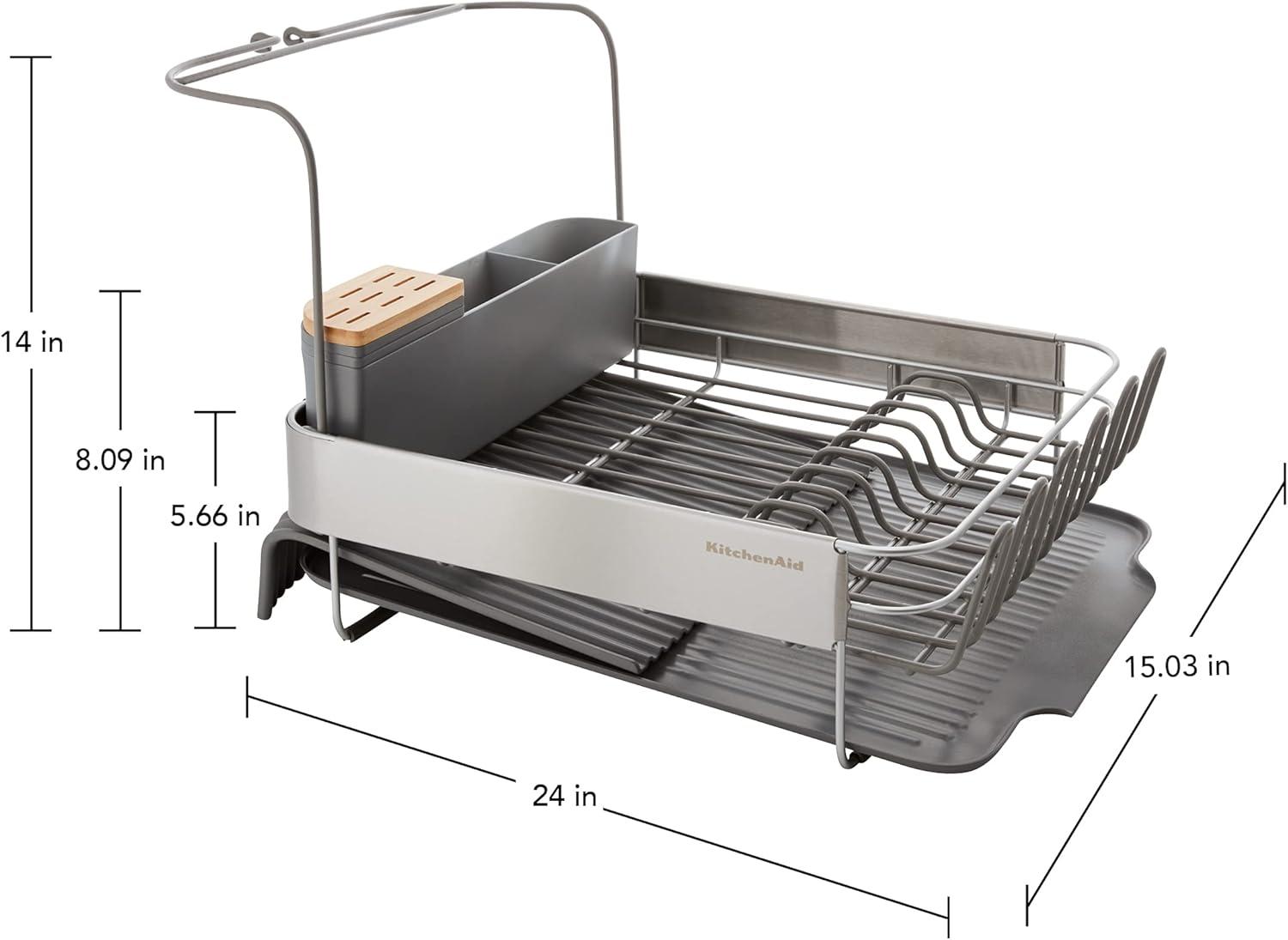 KitchenAid Large Capacity Full Size Rust Resistant Dish Rack with Angled Drain Board and Removable Flatware Caddy, Light Grey(Charcoal)