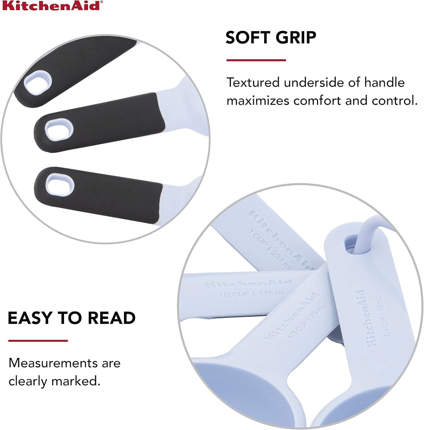 This KitchenAid 9-Piece Measuring Set includes essential tools you need to measure both wet and dry ingredients. Soft grips under the handles maximize comfort and control while using, and the measurements are clearly marked and easy to read. The set includes:includes 1/4, 1/2, 1/3, and 1 cup sizes, and 1 tablespoon, 1/2 tablespoon, 1 teaspoon, 1/2 teaspoon, and 1/4 teaspoon sizes. Dishwasher safe.