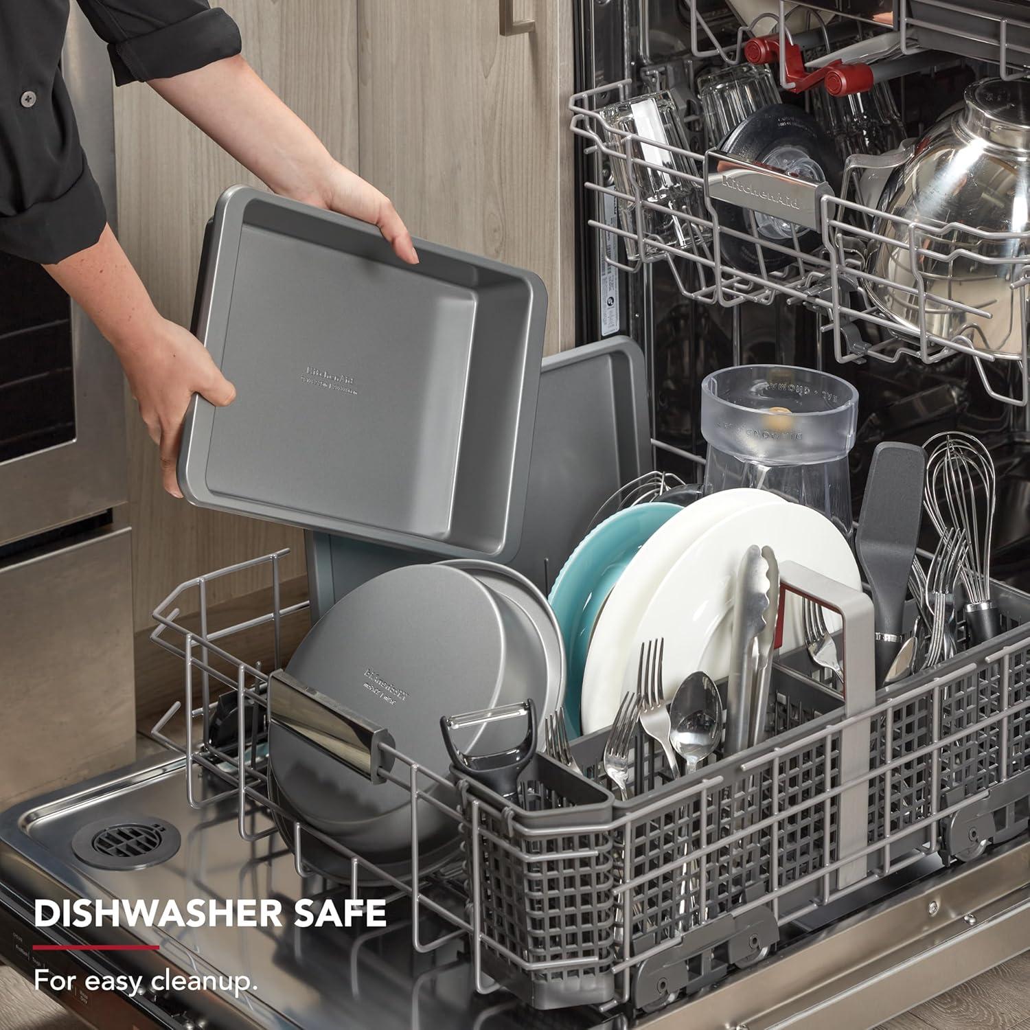 The KitchenAid 9-inch Round Cake Pan is perfect for making layer cakes, casseroles, quiches, and macaroni and cheese. Highly durable, this nonstick, oven-safe, heavy-duty aluminized steel pan stands up to high heat for all your baking needs and features a uniquely designed rim to prevent warping. It evenly distributes heat for consistent baking results and has extended handles that provide a secure grip for easy transport. Dishwasher safe.