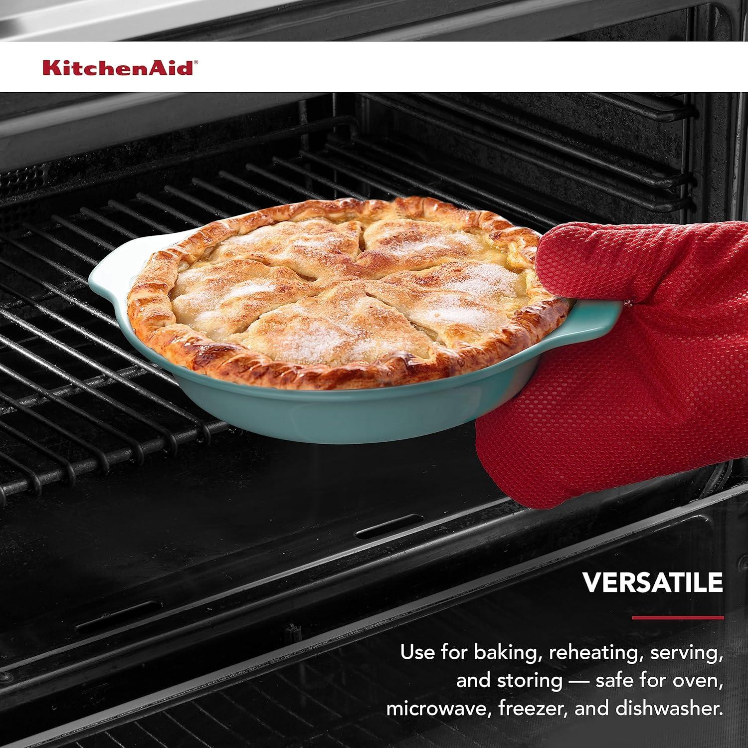 This KitchenAid Pie Plate is a kitchen essential, ideal for baking pies, with fluted rims for making perfectly flaky crusts. Use to make casseroles for family meals. Made from highly durable stoneware, the vitrified construction offers chip and stain resistance. Expect professional results when using this nonporous bakeware, which provides even heat distribution and retention. This versatile, beautiful piece is ideal for both baking, serving, and is safe for oven, freezer, microwave, and dishwasher. Also, the lid can be used as a trivet when cooled and clean. Measures: 9 x 2 inch (inner); 12.52 x 10.83 x 2.17 inch (outer). Lifetime Limited Warranty.