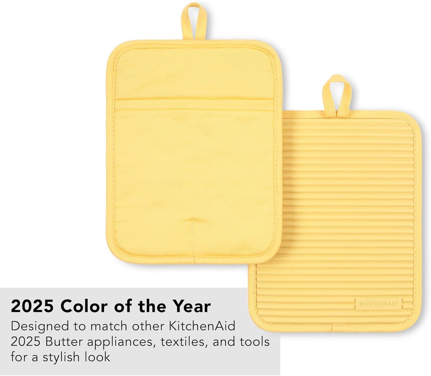KitchenAid Ribbed Soft Silicone Pot Holder 2-Pack Set, Blue Velvet, 7″x9″(Butter Yellow)