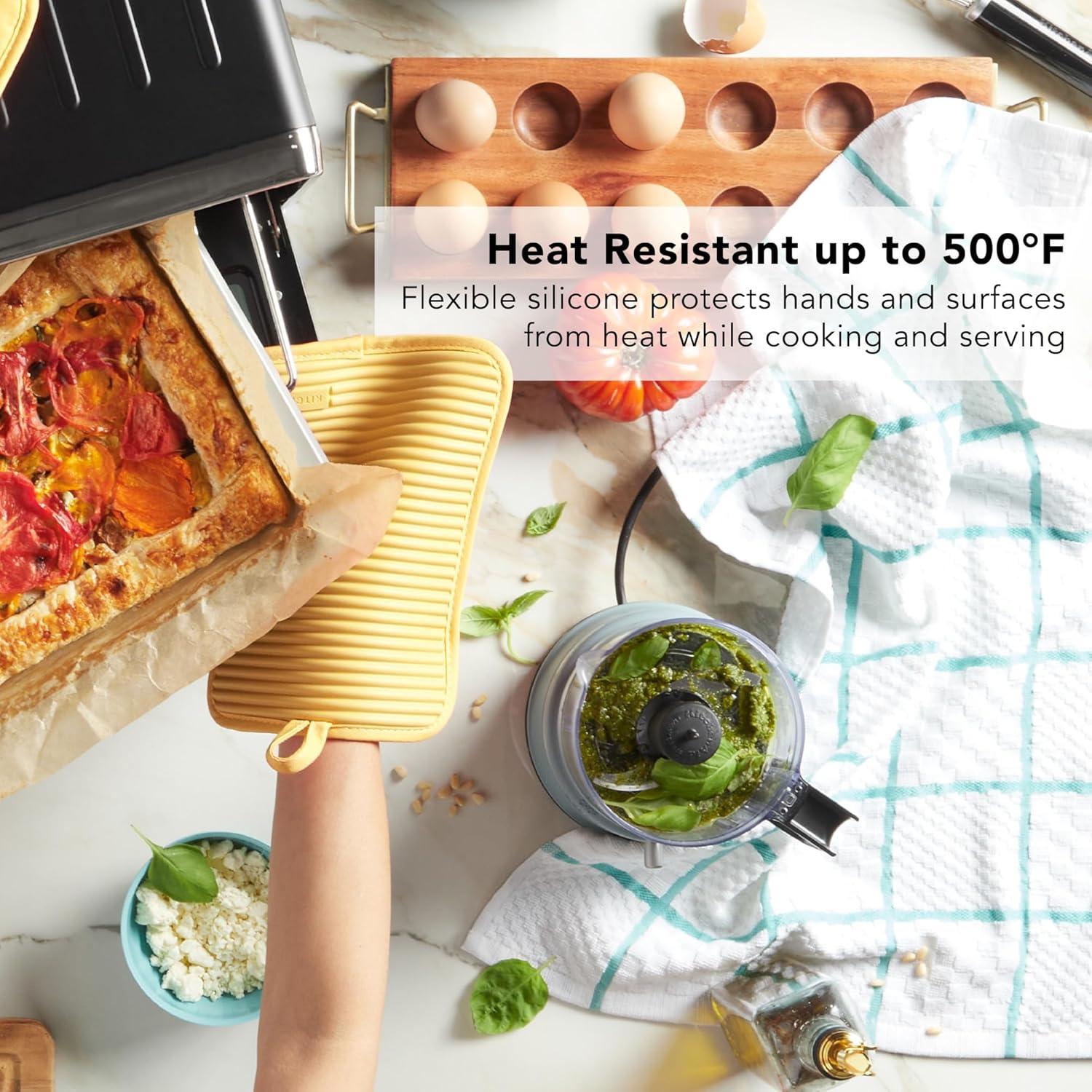 DURABLE, HEAT RESISTANT SILICONE: The KitchenAid Ribbed Soft Silicone pot holders are heat resistant up to 500 degrees Fahrenheit to safely shield hands from the heat while cooking and handling hot pans and dishes.