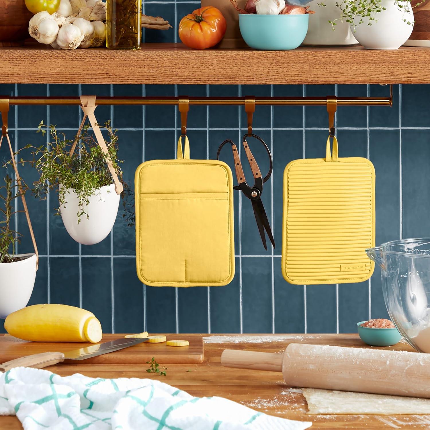 KitchenAid Ribbed Soft Silicone Pot Holder 2-Pack Set, Mineral Water Aqua, 7″x9″(Butter Yellow)