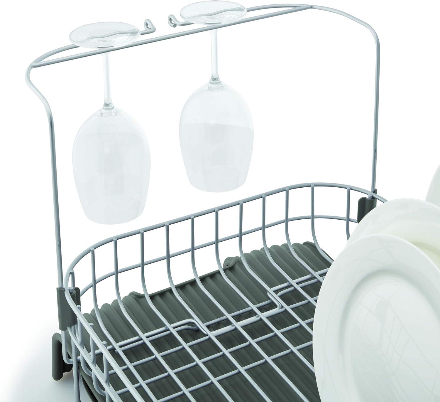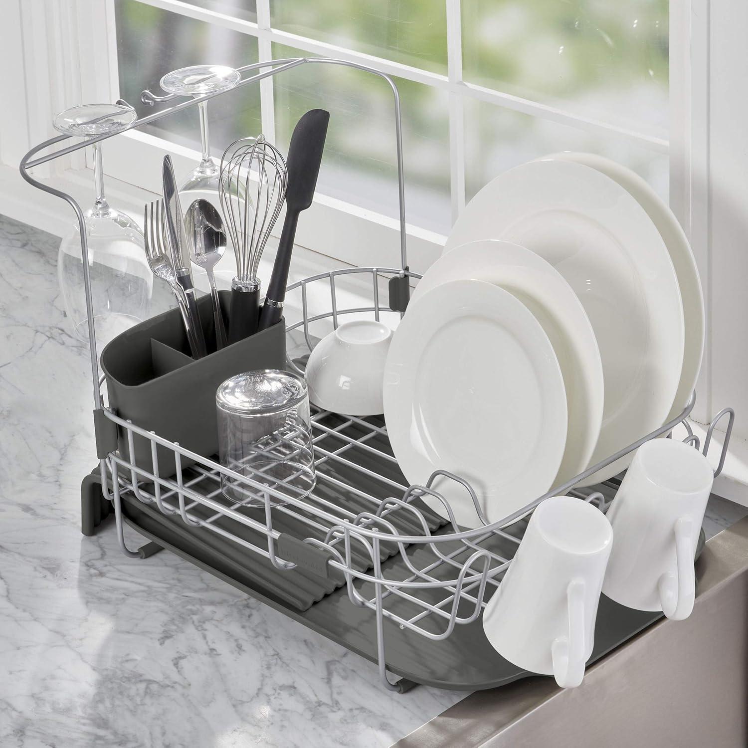 This Satin Wire Expandable Dish Rack from KitchenAid features a plastic base that pulls out to provide more drying space when needed (expands from 19.5 to 27.5 inches) and holds up to 11 plates, 6 glasses, 4 stemware glasses and more. It features slots for dishes, a suspended bar slot for hanging stemware, hooks for holding mugs and cups, and a removable, 2-compartment plastic utensil holder. Strong and durable, the rack is constructed of rust-resistant satin wires and features soft feet to protect countertops and prevent slipping.